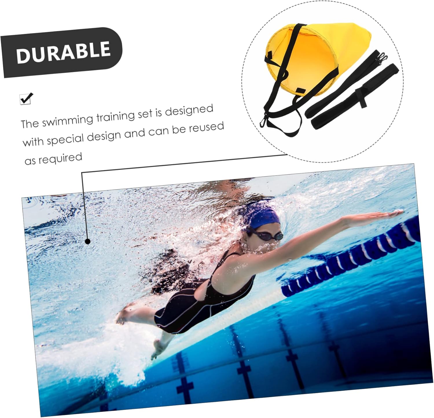 Package List1 x Resistance Parachute 1 x Shoulder Strap 1 x Binding StrapFeatures- The swim training band set is strong, suitable for both adults and children resistance parachute.-Material:Ribbon,Neoprene,PU Fabric swimming training cord- Designed to adapt to in-ground and above-ground pools, outdoor and indoor pools swimming belt.-Size:31.00X3.00X12.00cm/12.18X1.18X4 swim resistance parachute.- Creative design and practical, durable material, which brings you comfort swimming accessories.-Color:Yellow swim training equipment- With this resistance training set, there is no tools are required and no changes to your home pool or yard swim bungee training belt.- Effective low-impact workout for swimmers of all ages and proficiency levels swimming accessory.Goods Informationresistance trainer The cord is strong, suitable for both adults and children.swimming training device This is a swim resistance cord set which is made of good and wear-resist materials for durable use.swim exerciser belt The training tool can extend to longer.swim bungee training belt Swim cord set are made of premium material, which is durable and brings you comfort