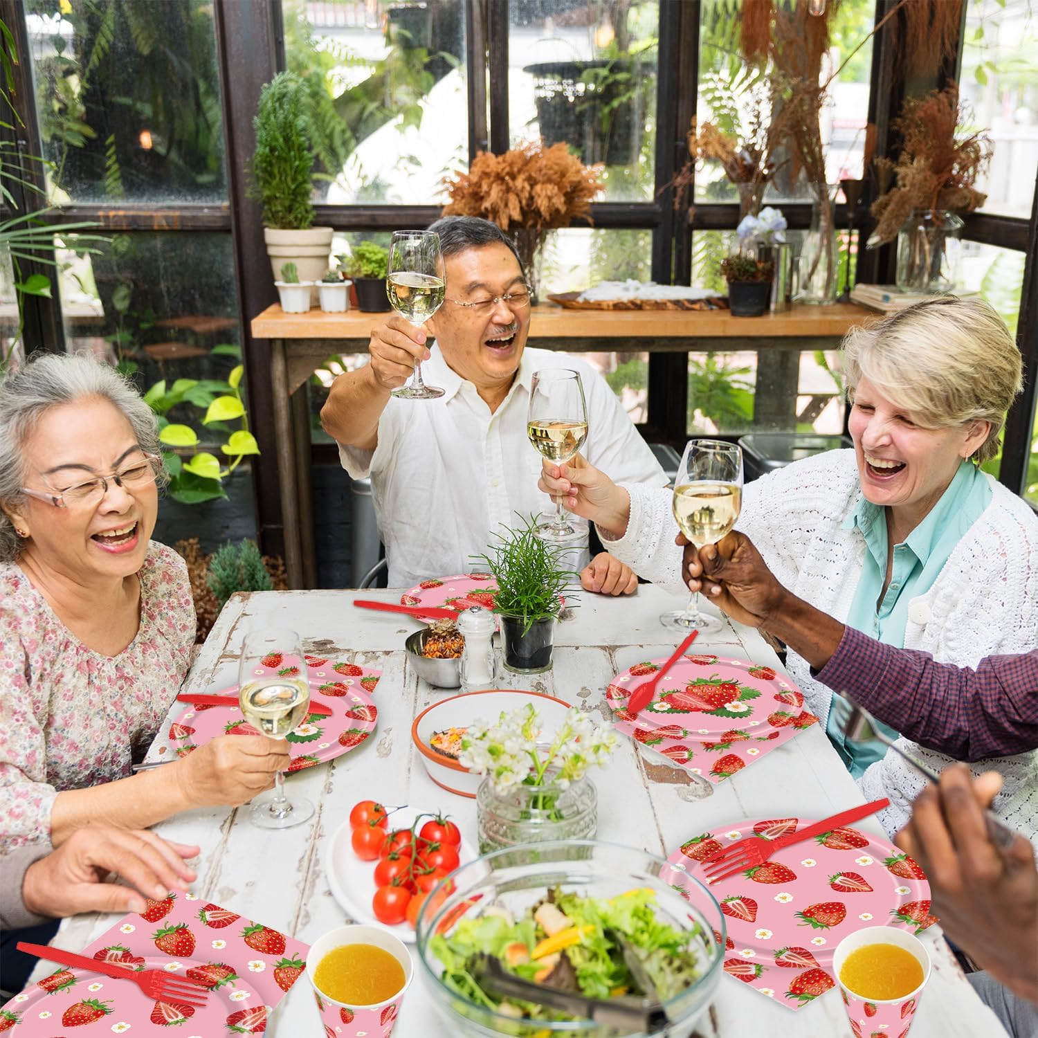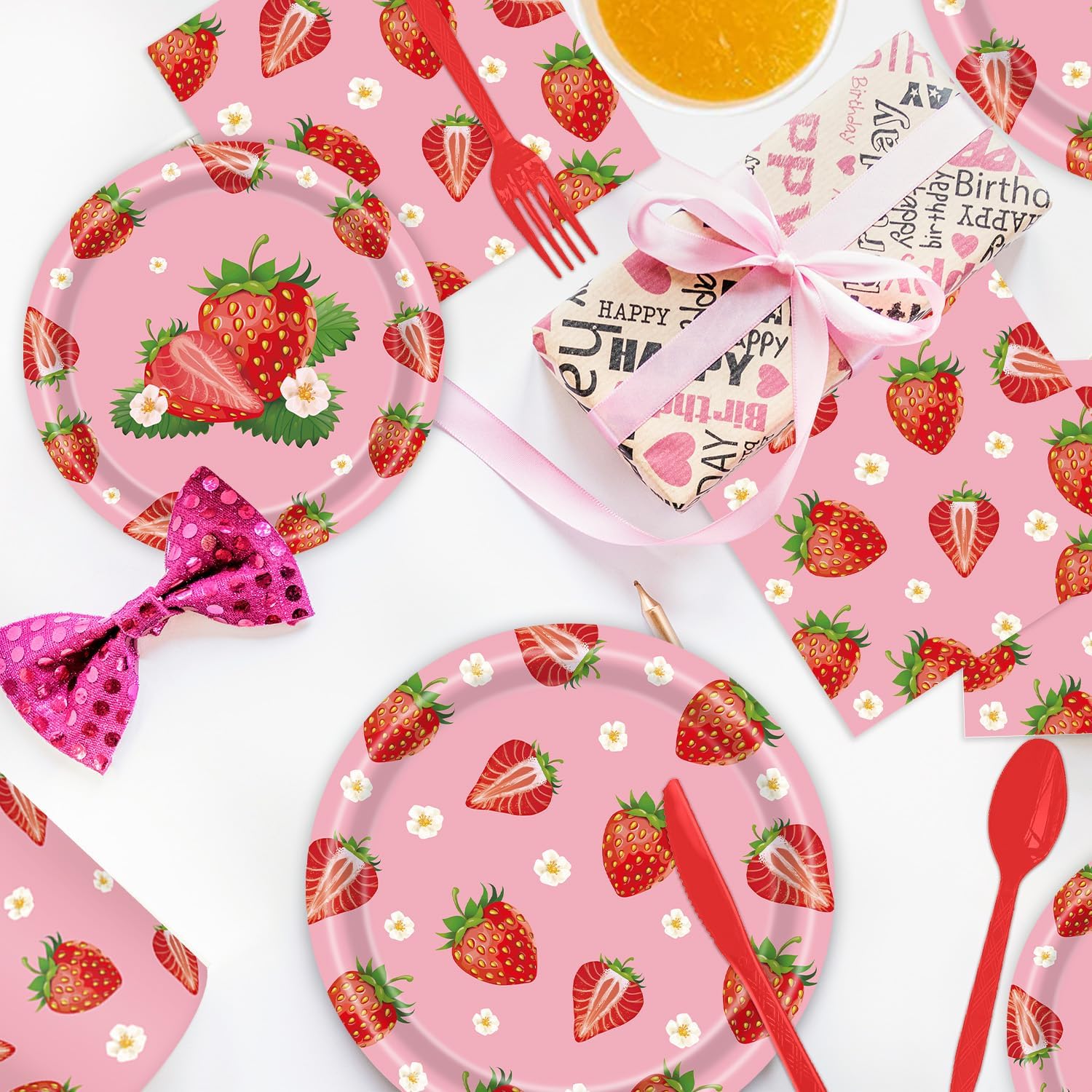 Create a vibrant and delicious atmosphere at your next party with our 140Pcs Strawberry Party Tableware Set. Perfect for girls' birthdays, baby showers, or any summer fruit-themed event, this set includes everything you need to create a memorable gathering for up to 20 guests. The set features vibrant strawberry paper plates, napkins, and cups, all adorned with a delightful strawberry print design. The elemental colors and pop of bright red will surely make your party stand out. With the included knife, fork, and spoon, you can easily serve your guests their favorite food without worrying about washing up afterwards. Save time and enjoy the sweet moments with this convenient and vibrant tableware set.