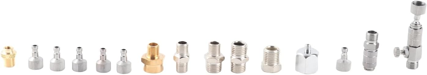 Feature: 1. [Including] With 7 pieces different types of 1/8 inch and 1/4 inch male and female connectors, 2 pieces quick disconnect connectors (adjustable pressure), and 6 pieces 1/8 inch male connectors. 2. [Stainless Steel Material] Made of stainless steel material, strong structure, not easy to break and deform, proof, easy to store and carry. 3. [Simple To Install] Designed for airbrush, air hose and compressors, when you need to use it for multiple spray guns, there is no need to release the air pressure, so you can quickly replace the airbrush. 4. [Labor Saving] Airbrush adapter set is used to connect the air hose and airbrush, which is easy to use and install, it can save you a lot of time and energy when using it. 5. [Widely Compatible] Compatible with most airbrush, fit for Master, for Pointzero, for Iwata, for Hansa, for Sparmax, for to meet your various need. Specification: Item Type: Airbrush Adapter Material: Stainless steel Weight: Approx. 126g / 4.4oz Package List: 15 x Airbrush Adapter