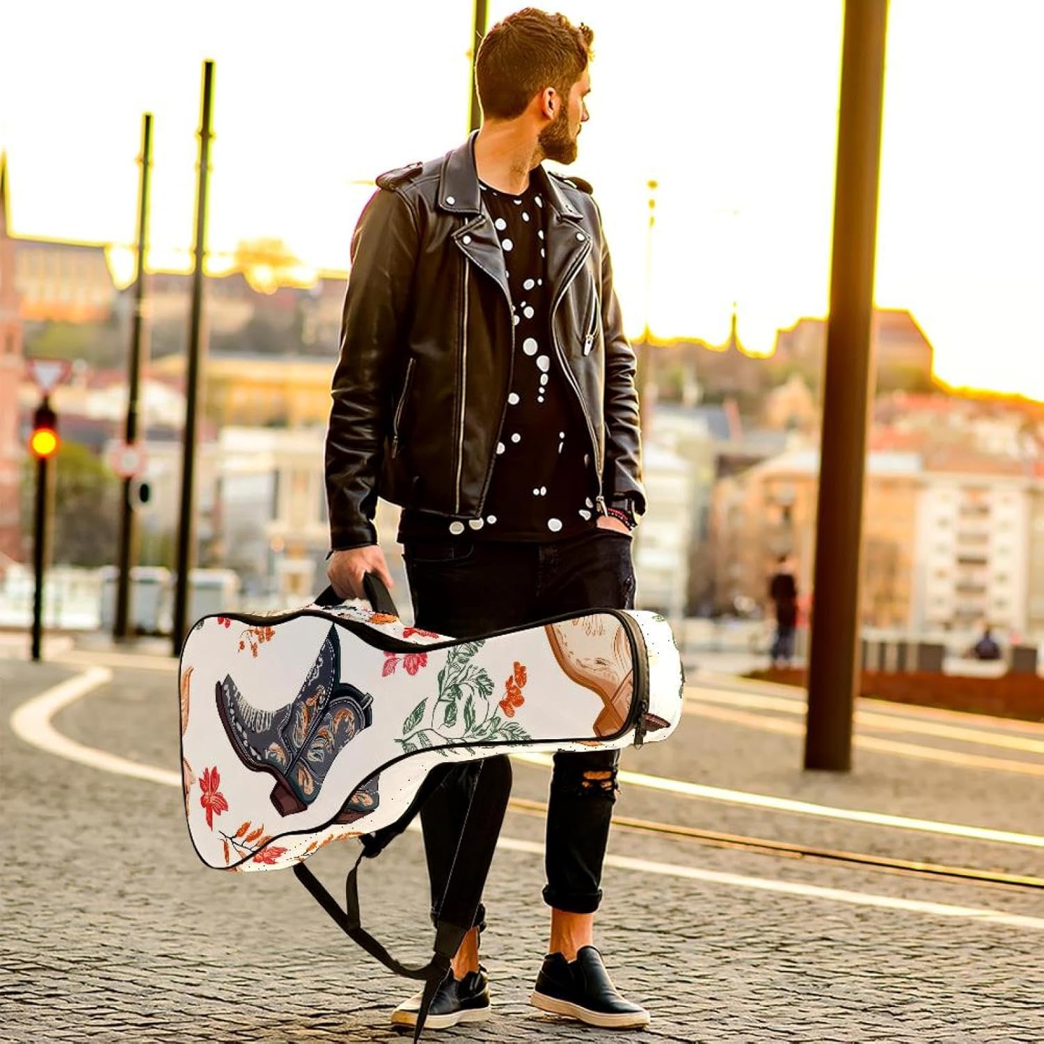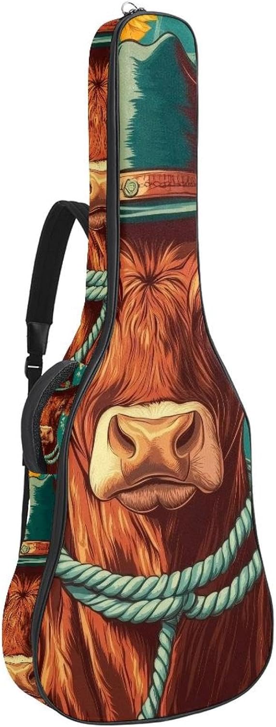 Give your valuable guitar the premium protection it deserves. Our Cute Printed Guitar Gig Bag is engineered for the modern musician who demands both security and convenience. Whether you're heading to a gig, a practice session, or on a short trip, this bag ensures your instrument arrives in perfect condition, ready to play.Constructed from durable, waterproof Oxford cloth, this bag stands up to the elements and the test of time. The interior is a sanctuary for your guitar, featuring ultra-thick padded sidewalls and a soft, anti-scratch lining that cradles your instrument, preventing scratches and damage. The heavy-duty rubber base acts as a shield against everyday bumps and allows for stable placement on any surface.Organization is effortless with multiple dedicated compartments. Two main storage pockets keep all your essential accessories—like a foldable music stand, tuner, picks, cables, and extra strings—neatly sorted and easily accessible. Never fumble for your tablet or sheet music again; the specially designed back pocket keeps them safe and separate.For a perfect, secure fit, the adjustable neck support and internal Velcro strap ensure your guitar does not shift around inside the bag, providing peace of mind with every carry.Care Instructions: To preserve the quality and appearance of your gig bag, please do not machine wash. Simply wipe clean with a damp cloth to remove any dirt or stains.