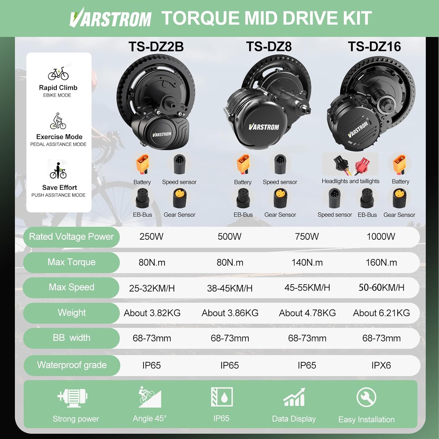 Varstrom × Tong-sheng 48V 500W/750W/1000W Mid drive Kit for 68-73MM Mountain Bike Road Bike With Battery and Display (Optional) Specification for Tong-sheng TS-DZ*2B TSDZ16 Mid Drive KitVolatage: 48VWattage: 500W/750W/1000WMotor Type: Brushless Geared MotorMotor Model: TS-DZ*2B/TSDZ16Bafang Motor Position: Mid MountedBafang Controller: Integrated, inside the MotorShaft Standard: JISOperating Temperature: -10-45℃Display (optional): Tong-sheng Version EKD01/DZ40/SW2-58Chainwheel: 42/44T/46TPacking List :Varstrom × Tong-sheng 48V 500W/750W/1000W Mid drive KitDisplay (optional)Battery (Optional) Brake Lever (Default) OR Brake SensorsThumb ThrottleCranks、ChainwheelSpeed Sensor & Magnets1T4 WirenessLock Nuts *1 set