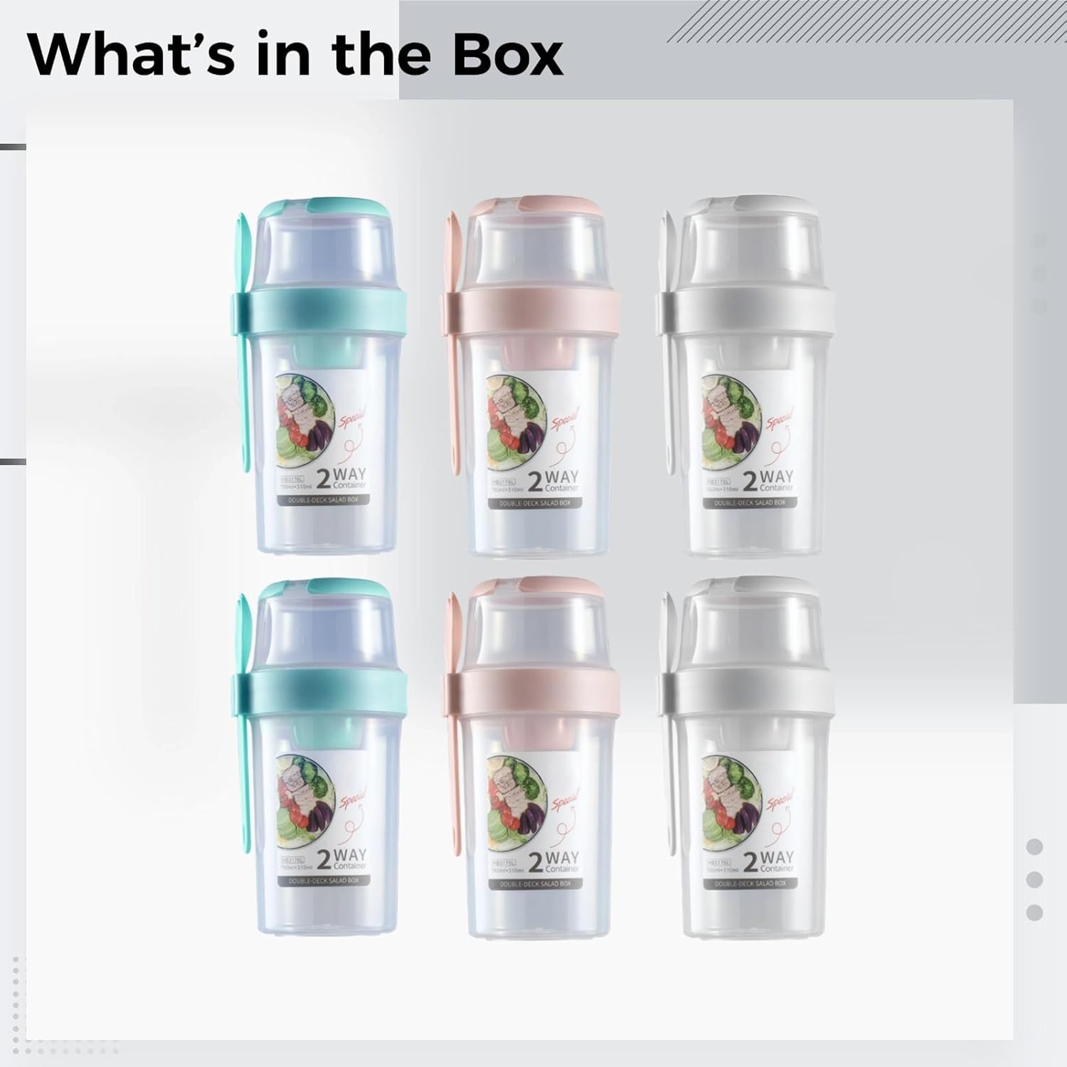 Color:Pink + white + cyan Material:PP Product Size: 8.46 in x 3.86 in x 3.86 in / 21.5 cm x 9.8 cm x 9.8 cm Package Includes:Pink salad container*2, white salad container*2, white salad container*2 Note: - Please refer to the measurement. Tiny measuring error is allowable in normal range. - There might be a little color difference due to the monitor, camera or other factors, please refer to the physical item.
