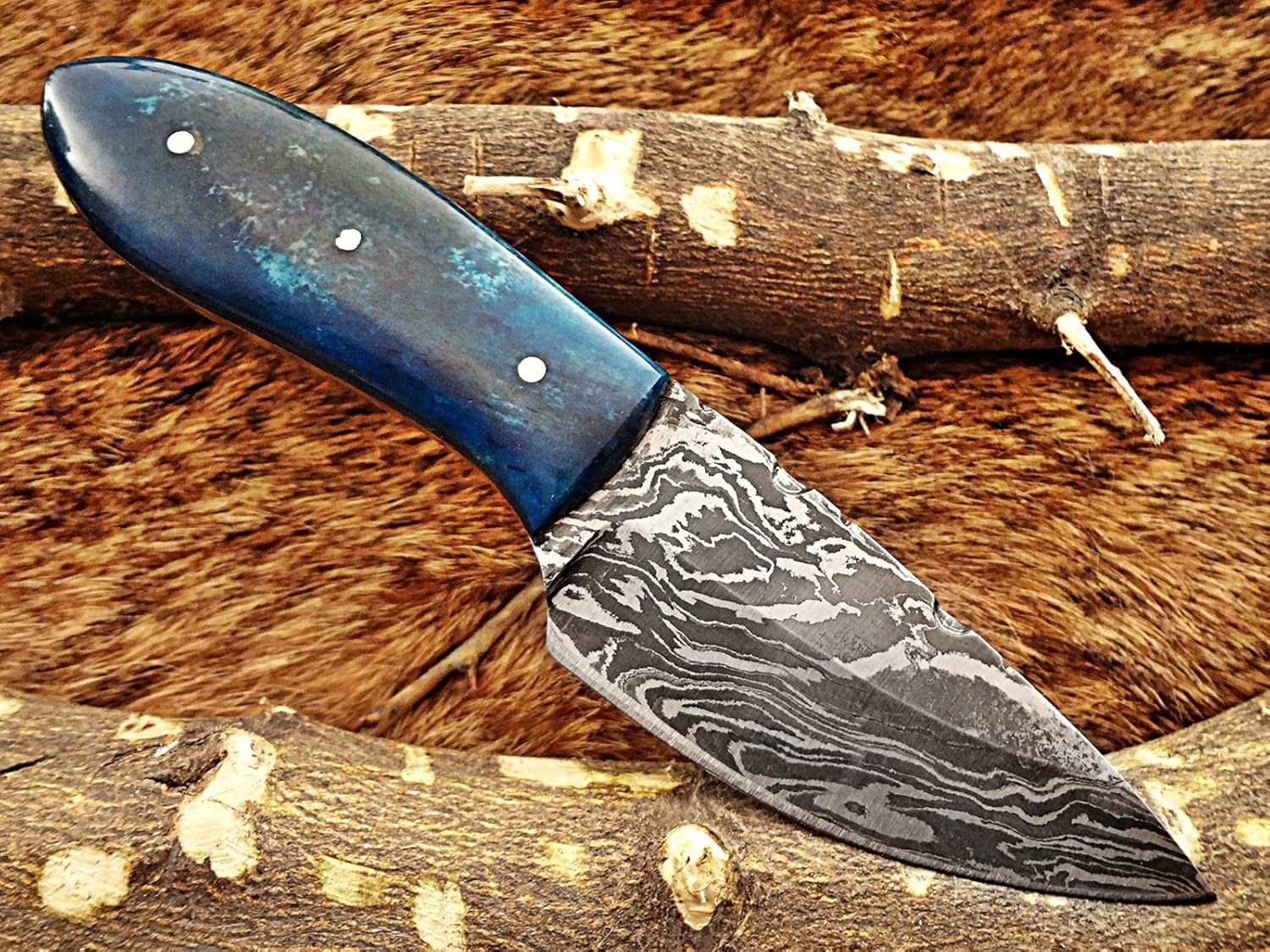 Features: Overall 6.5" Long with 3" long full tang blade Available in Jigged Bull Horn, White and Blue Camel Bone Scales 3.25" long Scale is bling with 3 silver for extra strength Full tang blades are considered stronger and durable then non full tang Approximately 5 mm Thick Twist pattern Damascus steel clip point blade Up to standard compact skinning , Pocket and camping Knife Comes with a fine quality extra thick and robust leather sheath. The sheath has belt inserting loop and can be worn on belt. Blade is made of Damascus steel by forging the 1095 and 15N20 high and low carbon steel Our Damascus steel is prepared by forging over 465 layer of high carbon and low carbon steel. Blade has been given an excellent heat treatment to get it well hardened Hardness 56 to 58 HRC. Tips to Care Damascus knife: Damascus steel as well as 1095 high carbon steel knives are different than some other common steel knives,because of its high carbon content they can be rusted if not care properly. If you have seen rust accidentally then use WD40 to remove it. Never store your knife for long time in leather sheath. Leather can absorb water which will rust the knife. Always clean the blade after using and apply oil or wax (please use cooking oil on Chef Knife) before you store it, for its longer life and durability. DISCLAIMER: Our knives are very sharp so open and use them very carefully. We are not responsible for any injuries associated with the use of our knives. Our products are intended for legal use only by responsible buyers. We will not sell our products to anyone under the age of 18. We will not be responsible for lost mail if wrong address is provided. We will not be responsible for custom held items in your country (For international purchases only)