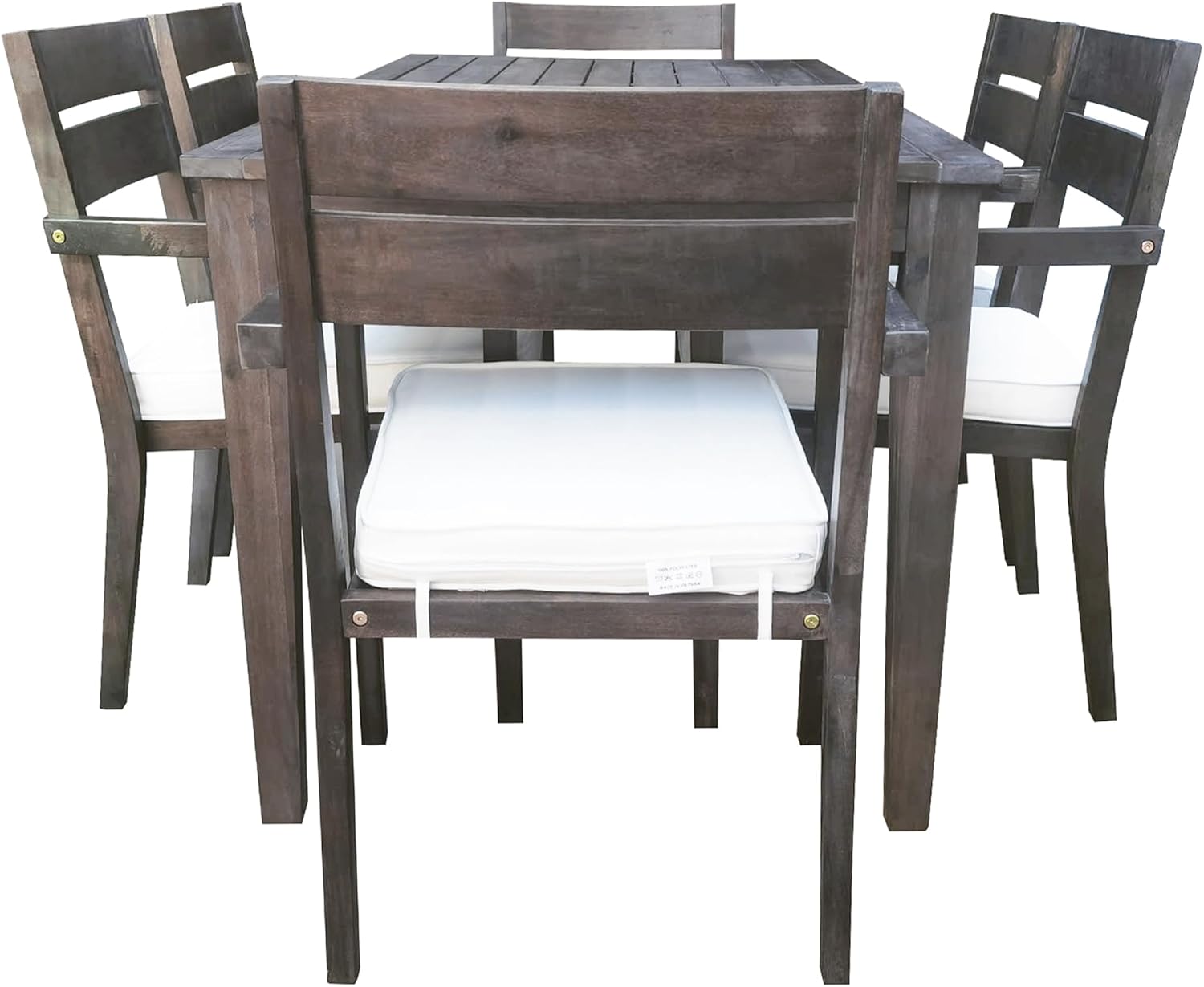 This 7-piece patio dining set includes 1 acacia wood dining table and 6 upholstered chairs, seats 6 people for outdoor and indoor use, adds decor to your patio, balcony, backyard, porch, looks vintage and beautiful, provides plenty of space for family and friends dinner parties, is eye-catching furniture for outdoor patios, and goes perfectly with any decor.The wide seat and backrest of this outdoor dining table set provide you with soft sitting feeling, the foam padded seat cushion is soft, breathable and flexible with ergonomic design and three sides surround.Weights & DimensionsSingle Chair Size:20.1''x22.4''x33.5''Table Size:70.9''x31.5''x29.5''Tabletop Thickness:0.9''Cushion Thickness:2.8''SpecificationsItems Included:6 Chair+1 TableCushion Color:BeigeTable And Chair Color:Dark BrownTable Material:Acacia WoodFrame Material:Acacia WoodCushion Cover Material:PolyesterCushion Filling Material:Foam+FiberCushion Cover Closure Method:ZipperTable Top Weight Capacity:350 lbsSingle Chair Capacity:250 lbsSingle Chair Net Weight:19.8 lbsTable Net Weight:26.4 lbsSupplier Intended and Approved Use:Residential UseCountry of Origin:Vietnam