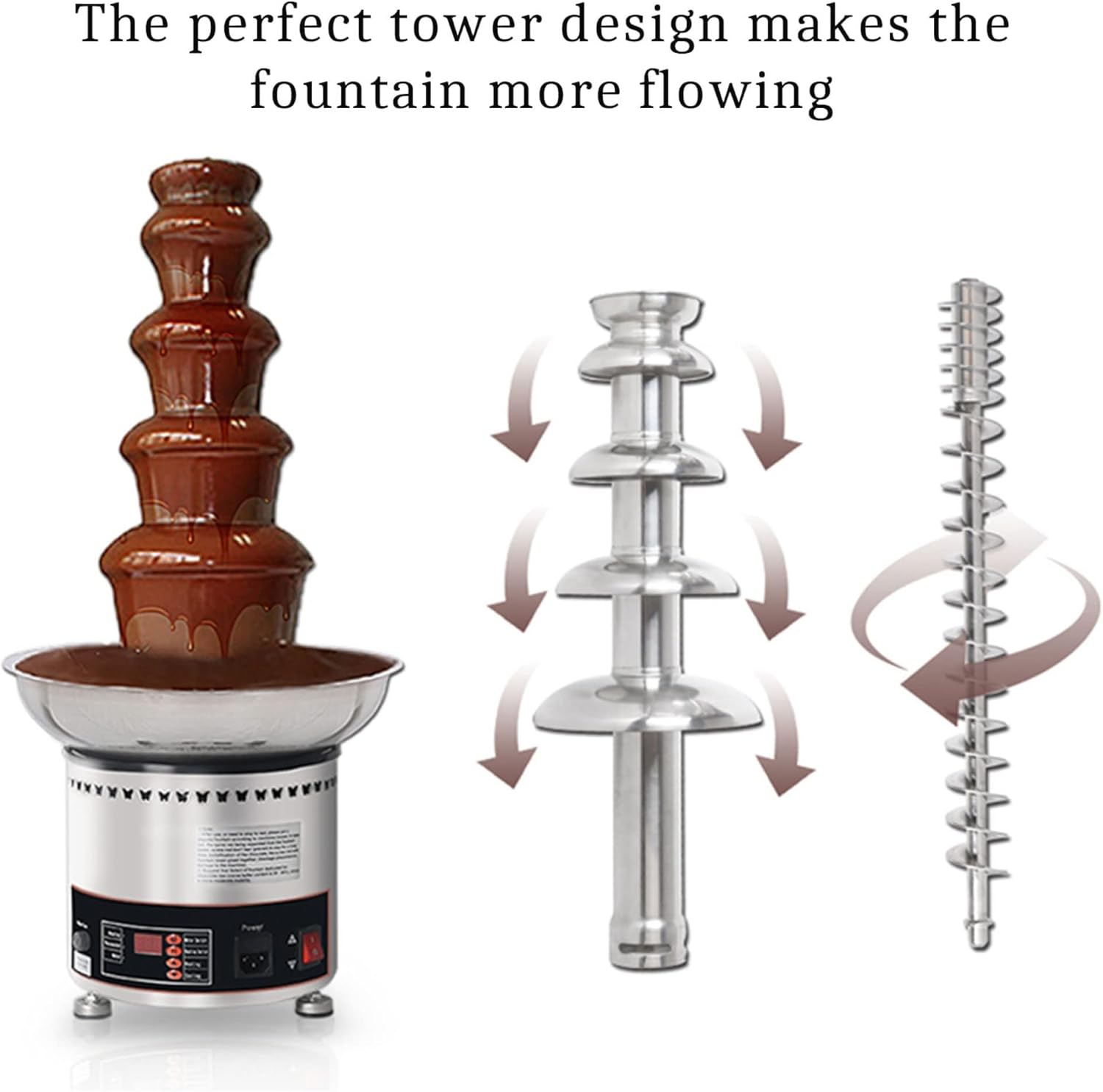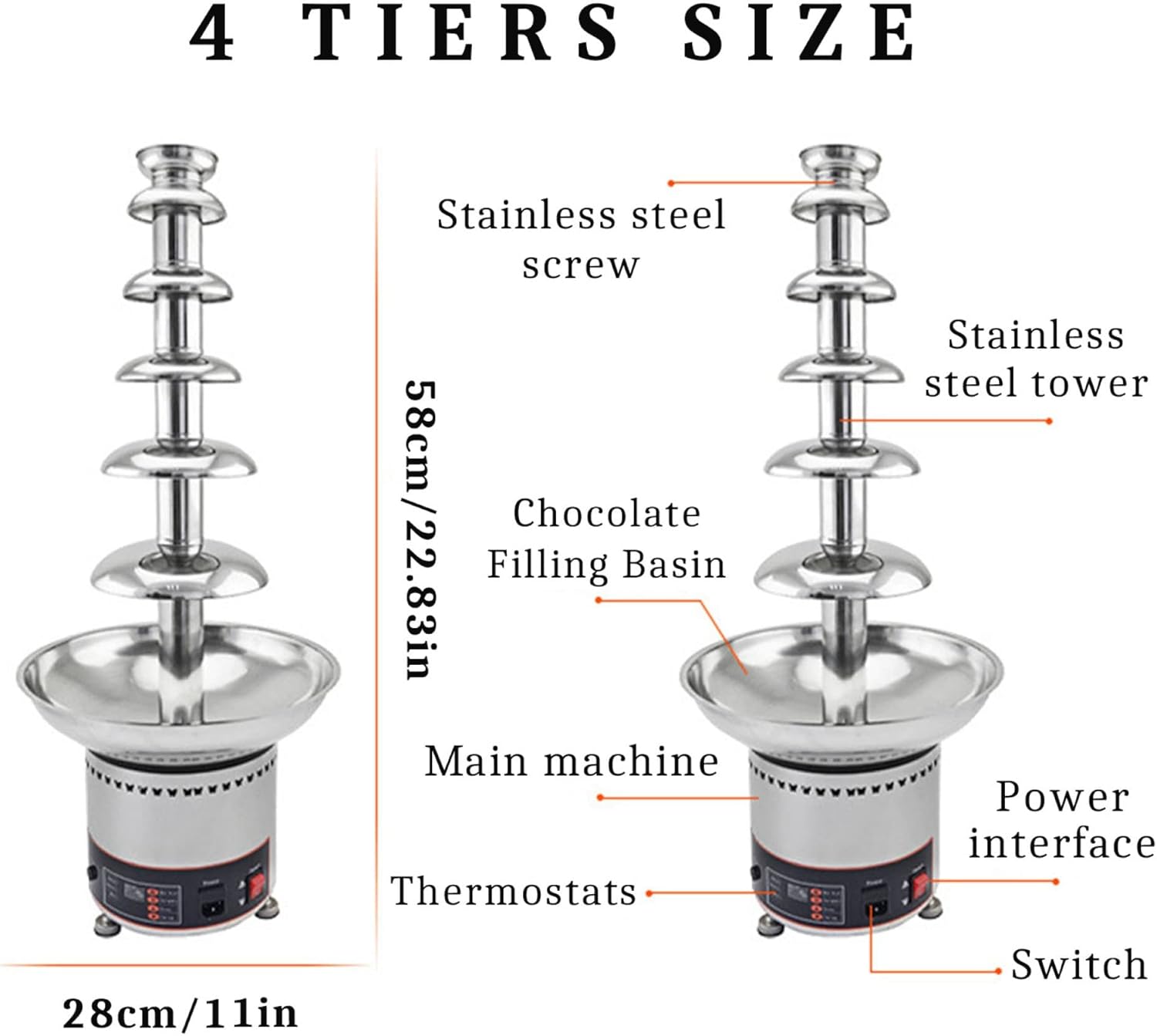 Our chocolate fountain can be used in shopping mall, hotel, western restaurant, wedding and graduation ceremony, company and birthday party, it can bring a relaxed and pleasant atmosphere. Features: -Lower noise with professional motor -Temperature control switch adjustable -Stainless steel bowl, tower and screw -Large chocolate pot prevent splashing -Melt chocolate automatically -Rubber righ seal avoid any chocolate leak -Works 12hours continuously -Easy to use and clean up Name: Chocolate Fondue Fountain Material: 304 stainless steel Voltage: 110V Temperature rang:30-150°C Size: 4 Tier Diameter: 28cm Height: 58cm Weight: 7.5kg Capacity: 3kg 5 Tier Diameter: 33cm Height: 68cm Weight: 8kg Capacity: 4kg 6 Tier Diameter: 36cm Height: 82cm Weight: 8.5kg Capacity: 6kg 7 Tier Diameter: 43cm Height: 103cm Weight: 12kg Capacity: 8kg Package includes Chocolate Fondue Fountain 1