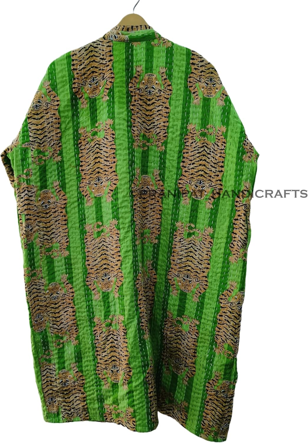 Embrace vibrant ethnic style with this lightweight cotton kantha jacket. Featuring a stunning tiger print pattern in shades of orange, pink, and purple, this open-front jacket is perfect for adding a touch of bohemian flair to any outfit. Crafted from soft cotton, it offers a comfortable and breathable wear. The mid-length design provides ample coverage, making it versatile for various occasions. Whether you're dressing up for a festival or seeking a stylish layering piece, this jacket is sure to turn heads. Hand-crafted with care, it's a unique and eye-catching addition to your wardrobe. Pair it with jeans or a dress for a chic and trendy look. Please note that hand washing is recommended to preserve the quality of this garment.