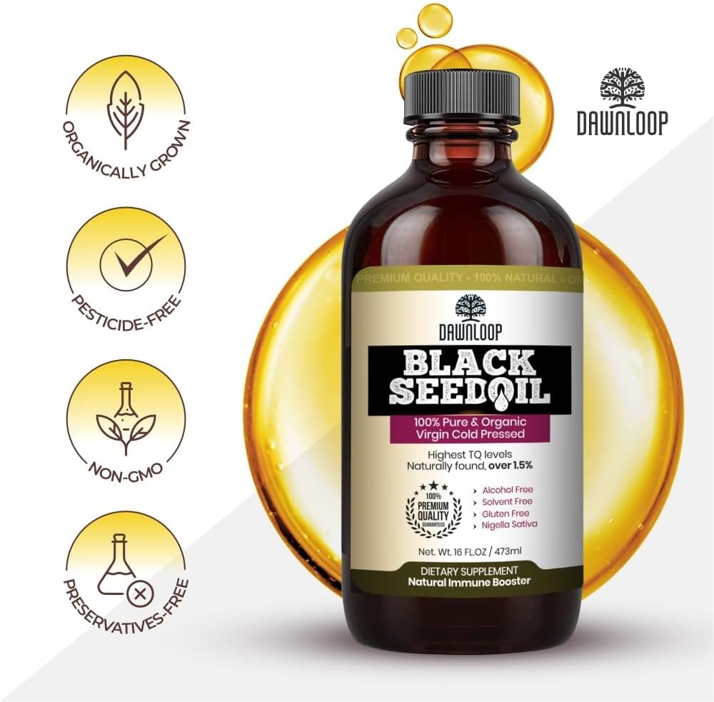"Discover the power of DAWNLOOP Black Seed Oil Organic Cold Pressed โ a premium wellness essential made from 100% pure Nigella sativa seeds. Our black cumin seed oil is cold-pressed to preserve its natural nutrients, including thymoquinone and essential fatty acids.This organic black seed oil supports your body's natural defenses, aids digestion, promotes joint mobility, and helps maintain healthy skin and hair. Whether taken as a daily supplement or used topically, our black seed oil liquid is a multi-functional superfood that fits into any lifestyle.Free from GMOs, gluten, and artificial additives, it's suitable for daily use. Enjoy the benefits of black seed oil cold pressed for immune support, beauty care, and overall vitality."