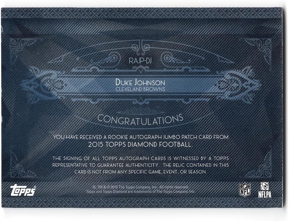 For your viewing pleasure: DUKE JOHNSON Topps Diamond Football 3-COLOR JERSEY PATCH AUTOGRAPH (Game Used Jersey) Cleveland Browns Football Trading Card. This rare card is #01/25 and has been hand-signed beautifully by Duke Johnson with teal ink. This autograph card is in great condition and was pulled from a fresh pack. It is certified and authenticated by the Topps Company. Please let us know if you have any questions.