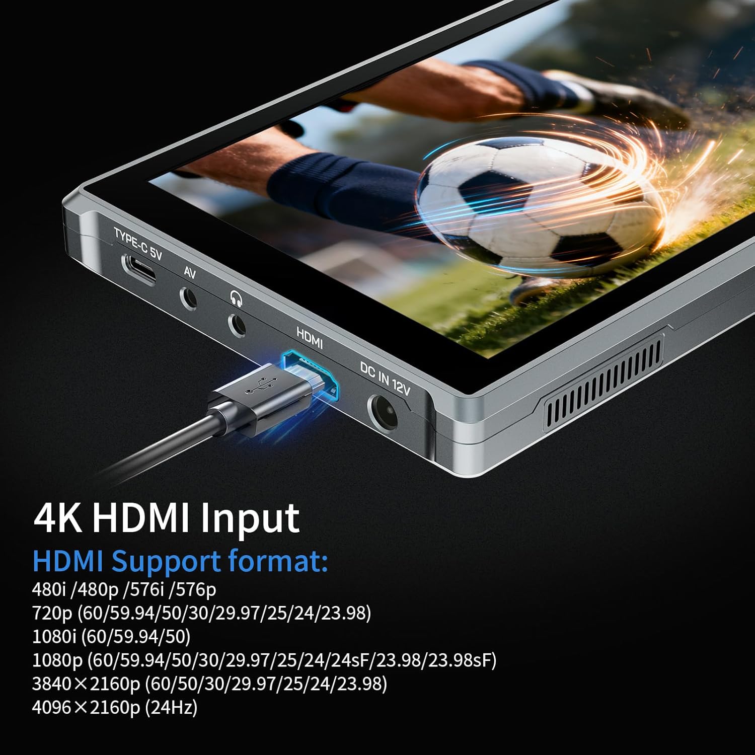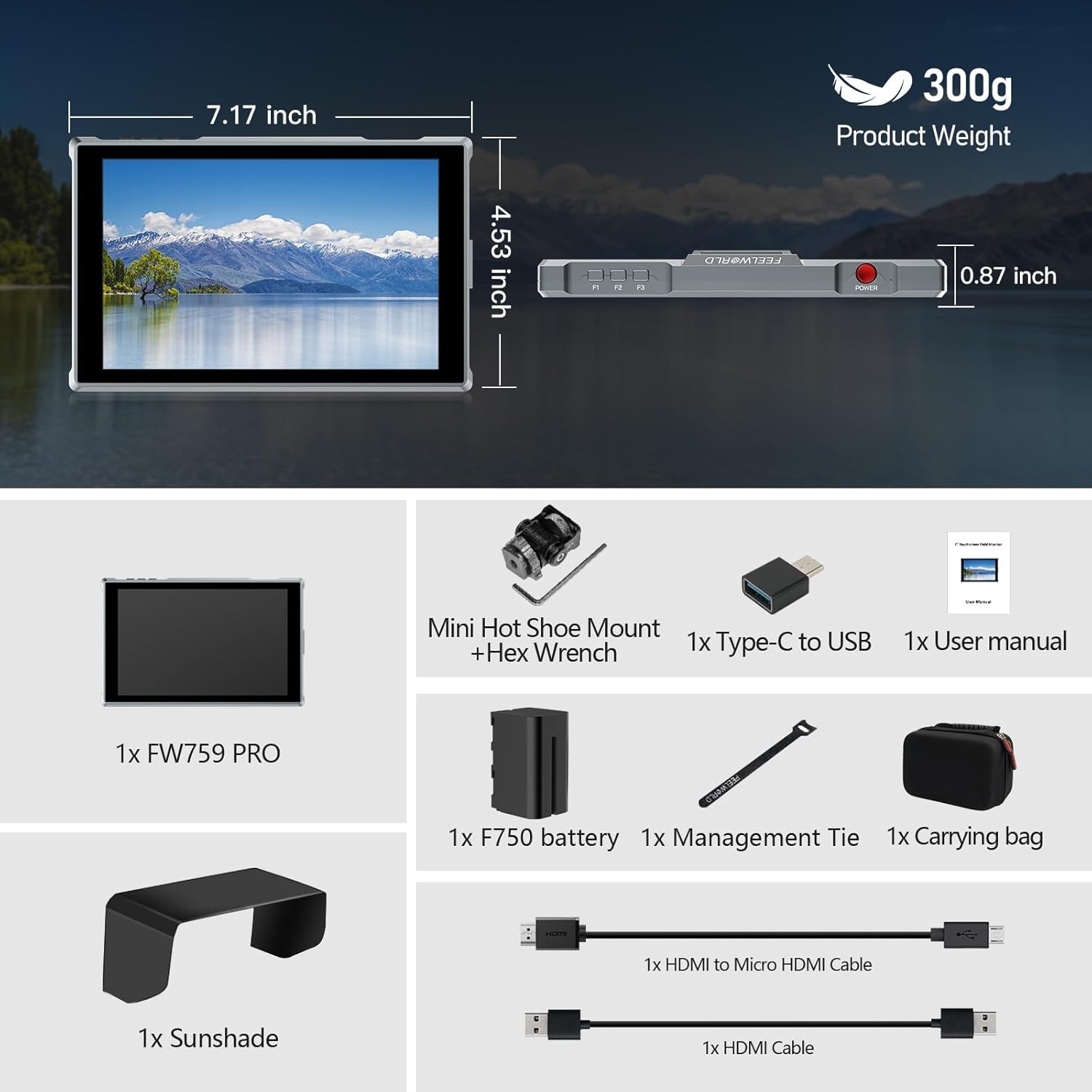 【7" IPS Touch Screen with HD 1280x800 Resolution】The FW759 Pro features a vibrant 7-inch IPS touchscreen display with 1280x800 HD resolution. The responsive touch interface allows for quick and smooth menu navigation and settings adjustment, significantly improving your on-set workflow and efficiency. 【Professional Focus & Exposure Assist Tools】Achieve perfect shots with a suite of professional monitoring tools including Focus Peaking, Zebra Patterns, False Color, Image Zoom, Flip (Horizontal/Vertical), and Frame Guides. These features ensure critical focus and accurate exposure for both photography and videography. 【Multiple Power Options & Long Battery Life】Enjoy extended operation with the included high-capacity 4200mAh F750 battery (approx. 6 hours runtime). For continuous use, the monitor also supports power via DC 12V input, USB-C 5V input, or standard NP-F style batteries (via optional plate), offering unmatched flexibility for any shooting environment. 【4K HDMI Input & Loop-Out, Wide Compatibility】Supports 4K UHD (3840x2160) and 2K HDMI signal input and loop-through output. Compatible with most DSLR, mirrorless cameras, camcorders, and other HDMI video sources, making it an ideal monitor for 4K and HD video production. 【Complete Ready-to-Use Bundle】This all-in-one kit includes everything you need: FEELWORLD FW759 Pro Monitor, F750 Battery, Protective Carry Case, Sunshade, HDMI Cable, Micro HDMI Cable, Mini Hot Shoe Mount, USB-A to C Adapter, Cable Tie, and User Manual. Start monitoring right out of the box.