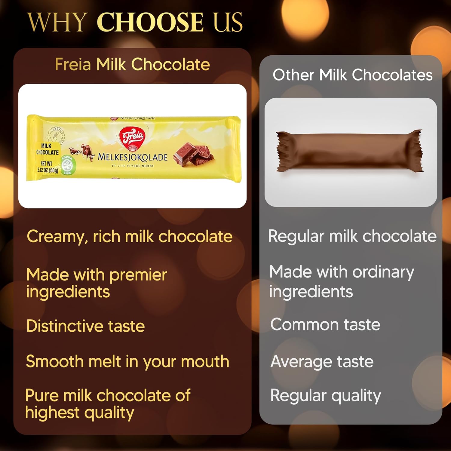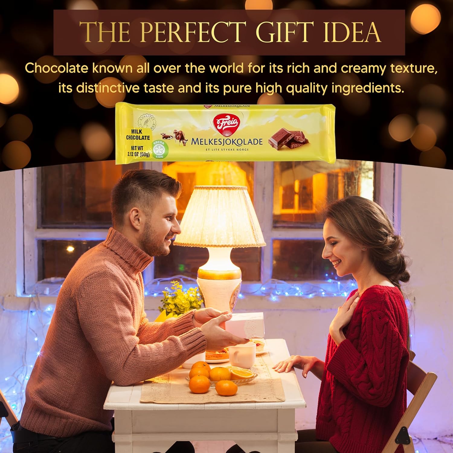 Just a few chocolates have the power to bring back fond memories of home. For over 100 years, Freia has remained one of the most loved and well-respected chocolatiers in Norway. Whenever you see their chocolate bars in their distinctive yellow wrapping, you just can't wait to tear one open and indulge in sinfully decadent chocolate. If your sweet tooth starts craving for this classic Norwegian chocolate confection, we've got you covered. Our Norwegian milk chocolate bars take you back to the warmth and comfort of home with each satisfying bite. Experience sensational chocolate like never before with the Freia Norwegian Melkesjokolade Bars. A treasured classic from 1920, the Freia milk chocolate bar is a staple in Norwegian households. Delicate, creamy, and rich, this milk chocolate bar's familiar taste evokes images of your childhood, staying at home and sharing luscious treats with your loved ones. What makes our chocolate bars special is how they're crafted by expert chocolatiers from the finest ingredients. Each chocolate bar uses milk from Norwegian cows, giving it that deep and distinctive taste that you'll find irresistible and cannot find anywhere else. Each pack contains 12 60g Norwegian milk chocolate bars in their famous yellow wrapping. Give these gourmet confectioneries as a gift to a friend or loved one on any special day. Need more time to decide? Here are more reasons to love our legendary milk chocolate bars: - Smooth, well-balanced taste - Pure milk chocolate goodness - Made in Norway by a brand with more than a century of industry experience Bring back nostalgic memories with each luscious bite. Add the Freia Norwegian Melkesjokolade Bars to your cart NOW!
