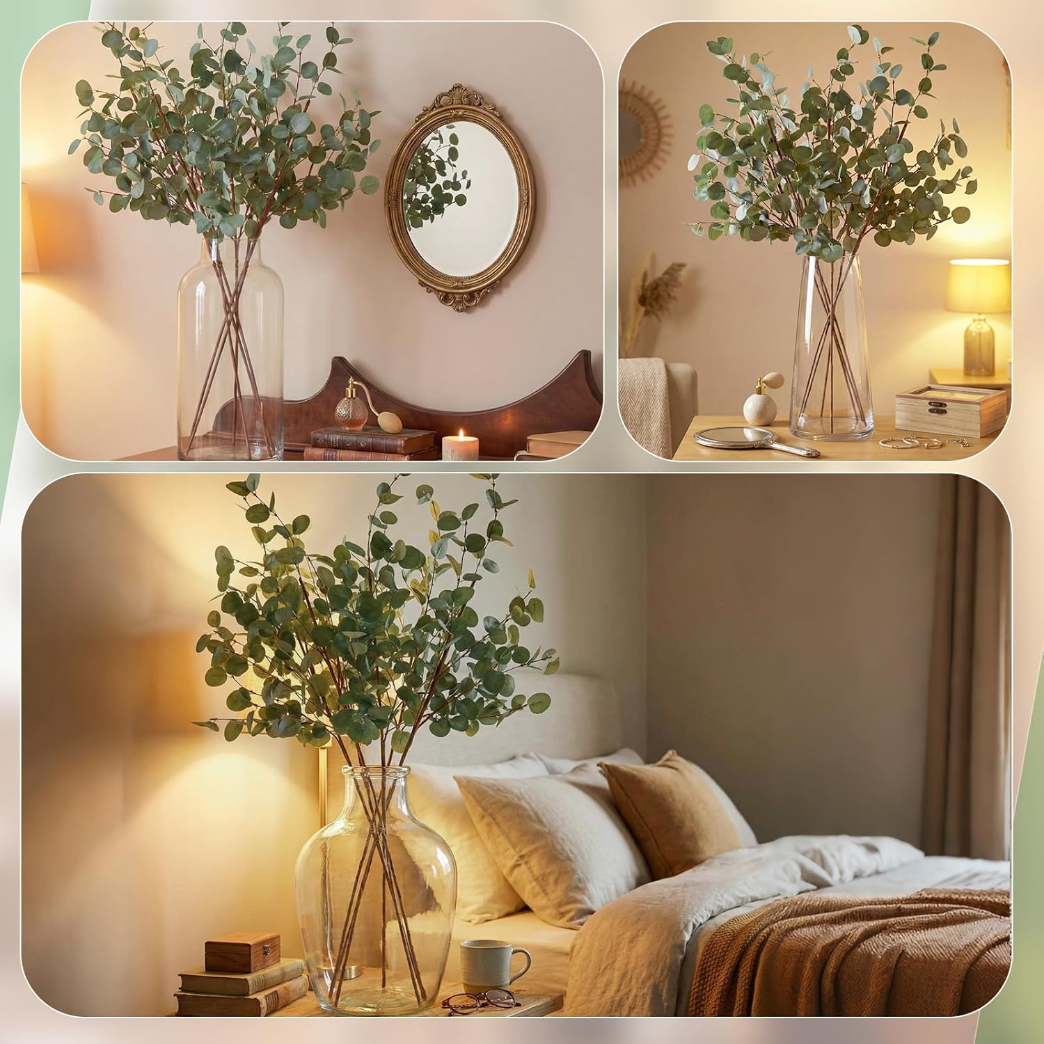 Features: Home Decoration: These fake eucalyptus stems are suitable for placing in vases on desks, offices, kitchens, bookshelves, or coffee tables. They serve as charming decor to accentuate spaces and elevate your home style. Thoughtful Gift: These greenery stems make a thoughtful gift for friends, whether for housewarmings, birthdays, festivals, or other special occasions. They bring a touch of natural beauty to their new home or living space, serving as a practical and elegant present that conveys your sincere blessings. Specifications: Material: plastic and silk Color: green Size: about 30 inches/ 75 cm Package includes: 6 x Artificial eucalyptus Notes: Manual measurement, please allow slight errors on size. The color may exist a slight difference due to different screen displays