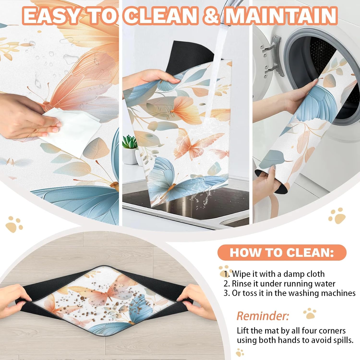 Pet Food Mat:Our company specializes in kitchen home products. The pet feeding mat provides the best decoration and protection for your floor. cat food mat measures 24 x 32 inches and is suitable for large dogs or puppies. The product specification is 1 pcs pet placemat. Dog bowl mat is made of diatomaceous earth material, with a water-absorbent backing to keep the floor clean.Dog and cat food mat can be placed under feeders, water bowls, litter boxes, etc., to prevent pets from wandering around. Dog food mat is washable by hand or machine and can be reused. It is suitable for use in homes, restaurants, kitchens, hotels, and business offices.