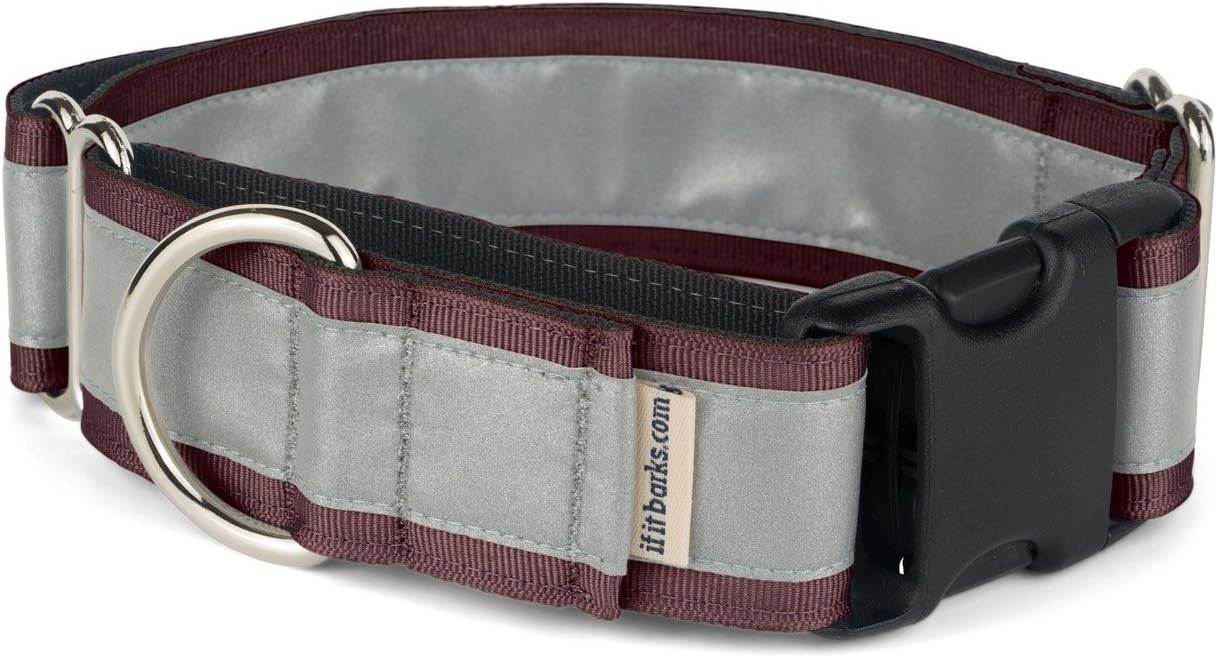 If It Barks reflective martingale dog collars with buckle, also known as limited slip collars, are highly recommended by dog trainers over your standard buckle collar or less humane choke chains. Benefits of Martingale Collars: - Dogs with small heads and big necks are not able to back out of the collar like traditional buckle style collars. - Martingales provide better control while walking your dog by applying even pressure around their neck. This reduces injury and choking. - The collar is constructed with two loops of webbing. One wraps around your dog's neck and the other is used to control the amount of closure of the collar when your dog begins to pull. How you adjust the collar determines the allowable closure. Features: - Genuine 3M reflective material for the best night time visibility. - Perfected since 2002, our design uses thin military spec nylon webbing which is approximately half the thickness of others. - The collar is decorated with durable polyester grosgrain ribbon that is easy to clean. - All hardware is durable metal for years of use. - Backed by the If It Barks warranty that if the stitching or hardware fails with regular wear, we'll replace it. - Handmade in North Carolina. - 1.5" inches (3.8 cm) wide in sizes small (11" - 15")(28 - 38cm), medium (15" - 22")(38 - 56cm) and large (19" - 30")(48 - 76cm) Measure Your Dog: Loosely measure the neck where the collar would normally sit sliding two fingers between the dog's neck and measuring tape. Measure the widest part of your dog's head. Order a collar that will fall within the range of these measurements. Care Instructions: If It Barks collars are machine washable. We suggest placing the collar in a pillowcase or lingerie bag to protect metal hardware. Line dry.