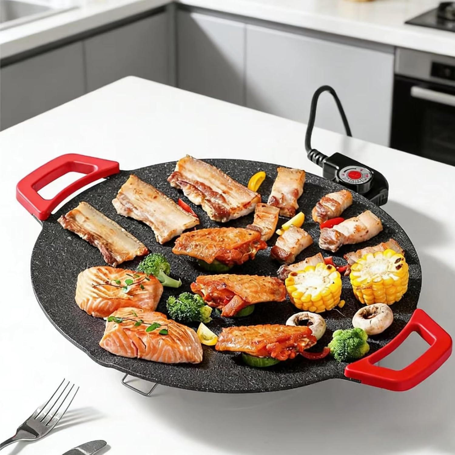 Electric Indoor Grill Nonstick Smokeless Round Griddle with Temperature Control Include Oil Brush Food Tongs for Kitchen Features: cooking with this advanced smokeless electric featuring nonstick coating to reduce oil fumes and food sticking. Crafted from metal, the pan ensures superior heat conduction for even cooking without hot spots or burning, and includes a sturdy handle for secure grip. Ideal for families with health conscious individuals, and cooking novices seeking a safe, user friendly appliance for indoor meals. Perfect for indoor Korean barbecue gatherings, family dinners, or quick meal preparations where easy cleanup are essential. Versatile for grilling, frying, and sautéing, this grill pan elevates everyday cooking while maintaining kitchen Specifications Component: Metal Size: Approx.36cm/14.17inch Package Includes: Package 1 Include:1Pc Electric Grill 1Pc Power Cable Note: 1.Please allow 1-2cm errors due to manual measurement, making sure that you not mind before order. 2.Due to the differences between different monitors, the picture may not reflect the actual of the item.