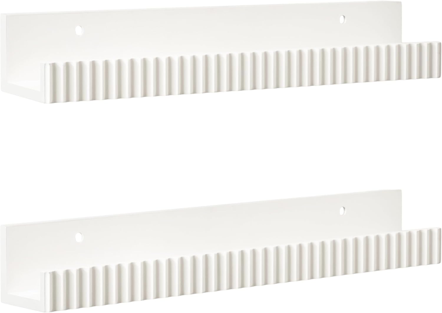 The Furrow ledge shelf set is a narrow method for displaying your favorite pictures and keepsakes in small spaces. This floating wall shelf set contains two shelves, each 24 inches wide, to mount flush against your wall and create a beautiful display space. This solid mango wood shelf set takes inspiration from modern design with a delightful scalloped face that adds texture to your space. Its durable wood construction has a weight capacity of 15 lbs. to mount your gallery without fear! It isn't just for picture frames, either; with a depth of 3.5 inches and a protective lip barrier, you can display your mini succulents and small household items easily. Display this modern and sophisticated shelf ledge as a gallery in your bedroom, living room, office, entryway, bathroom, or any other room that needs extra space with an organic modern silhouette. This shelf set comes fully assembled with hardware included, along with pre-drilled holes for easy wall mounting.