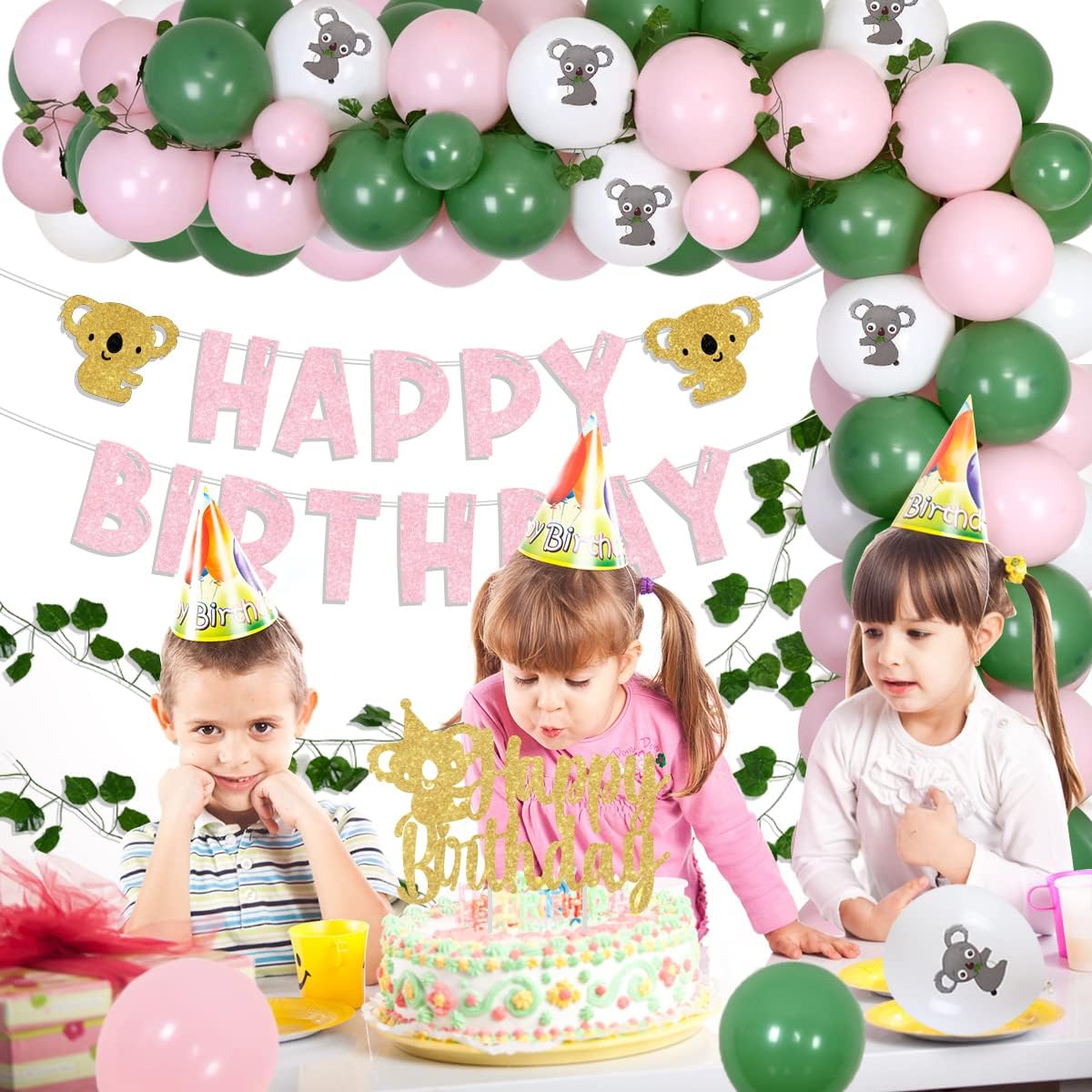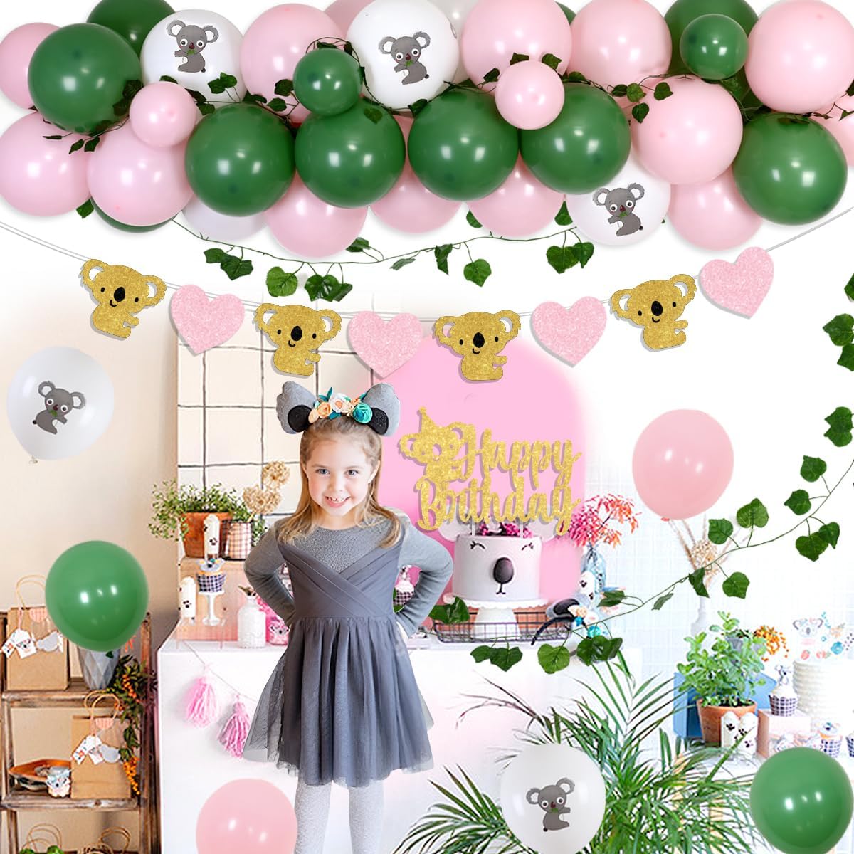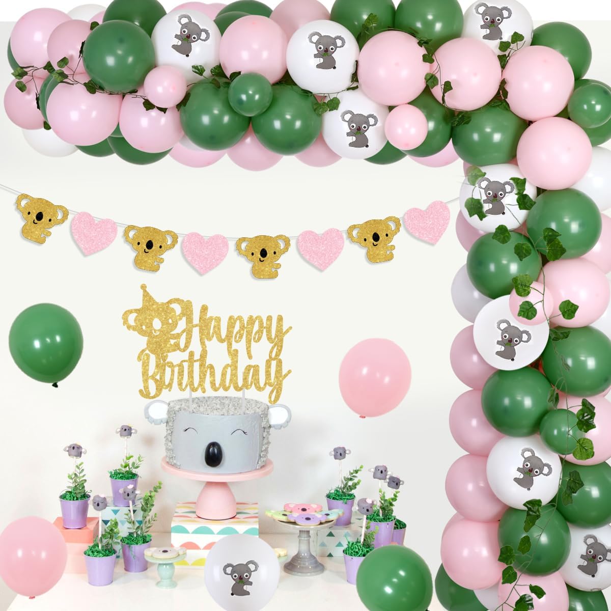 Our koala birthday party decorations include complete accessories such as banner, cake topper, latex balloons and foil balloon etc. Throwing a nice party for your cute girl!Package list: 50pcs latex balloons 12inches(10 white printed with koala, 20 avocado green, 20 light pink) 14pcs latex balloons 5inches (7 avocado green, 7 light pink) 1 set of artificial grape leaf vines 1pc koala happy birthday banner 1pc glitter koala garland 1pc koala birthday cake topper 5M balloon strip 1 roll of adhesive dots