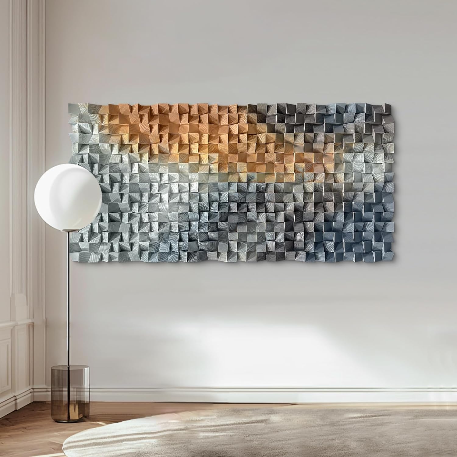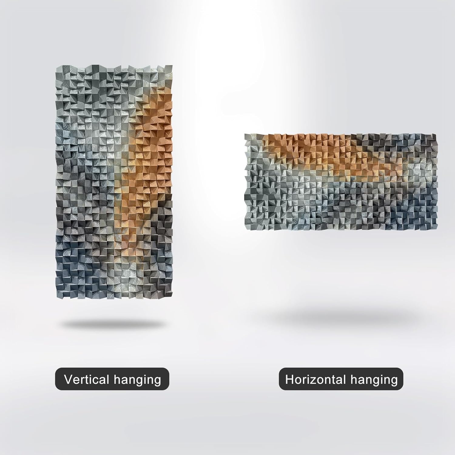 This large wall art wooden decoration adds a touch of natural and artistic beauty to modern spaces with its unique triangular wooden block shaping technique. The product is carefully crafted from high-quality wood, with each triangular wooden block assembled in three dimensions to create a dynamic and layered visual effect. It offers a variety of gradient color options from cool to warm tones to meet the decoration needs of different styles. As a member of our high-end wall art decoration series, this decoration is designed specifically for consumers who pursue individuality and quality. It measures 35.4"x70.8" and is suitable as the focal point of the wall, enhancing the overall artistic atmosphere of the space. The product is made of environmentally friendly wood, and the surface has been finely treated to display a natural wood grain texture, which is durable and stable. Easy to install, comes with detailed installation instructions and accessories, allowing you to easily secure it to the wall. Whether displayed independently or paired with other decorative elements, this decoration can add unique charm and style to your home or office environment.
