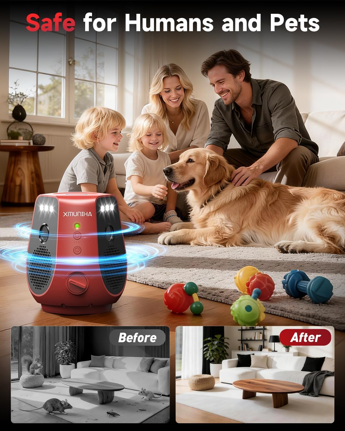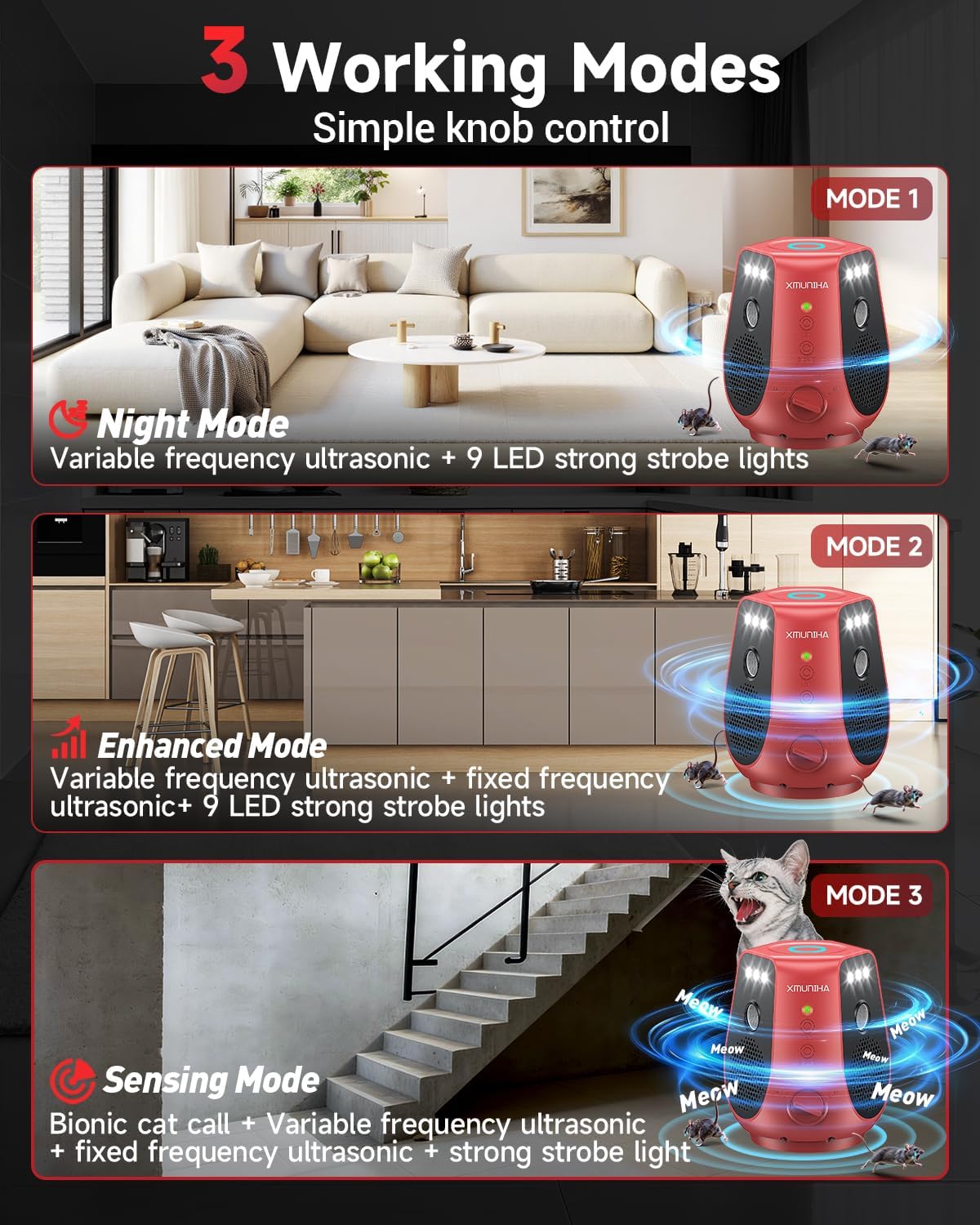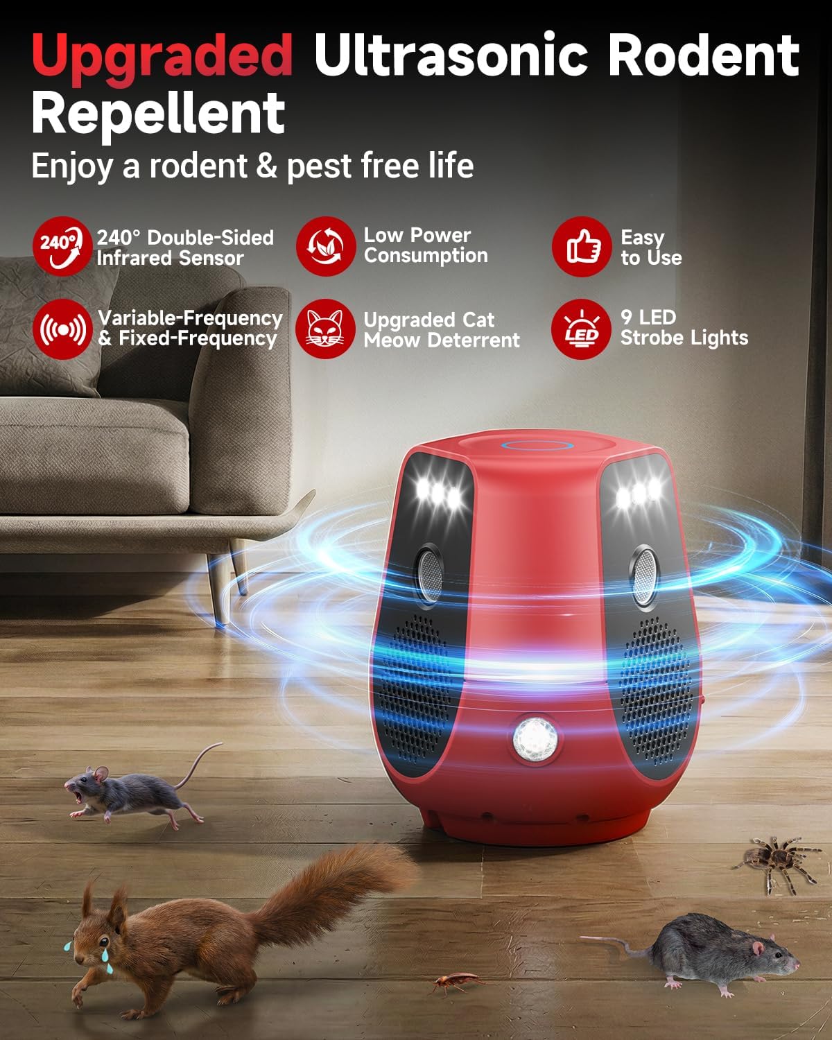 | Material Features | High Frequency Ultrasonic Rodent Repellent, Infrared Sensors on Both Sides, Lights Automatically Recognize And Activate Day And Night Modes, Multifunctional Ultrasonic Pest Repeller, Non Toxic, Powerful Ultrasonic Mouse Repellent, Variable Ultrasound + Fixed Pulse Ultrasound |
