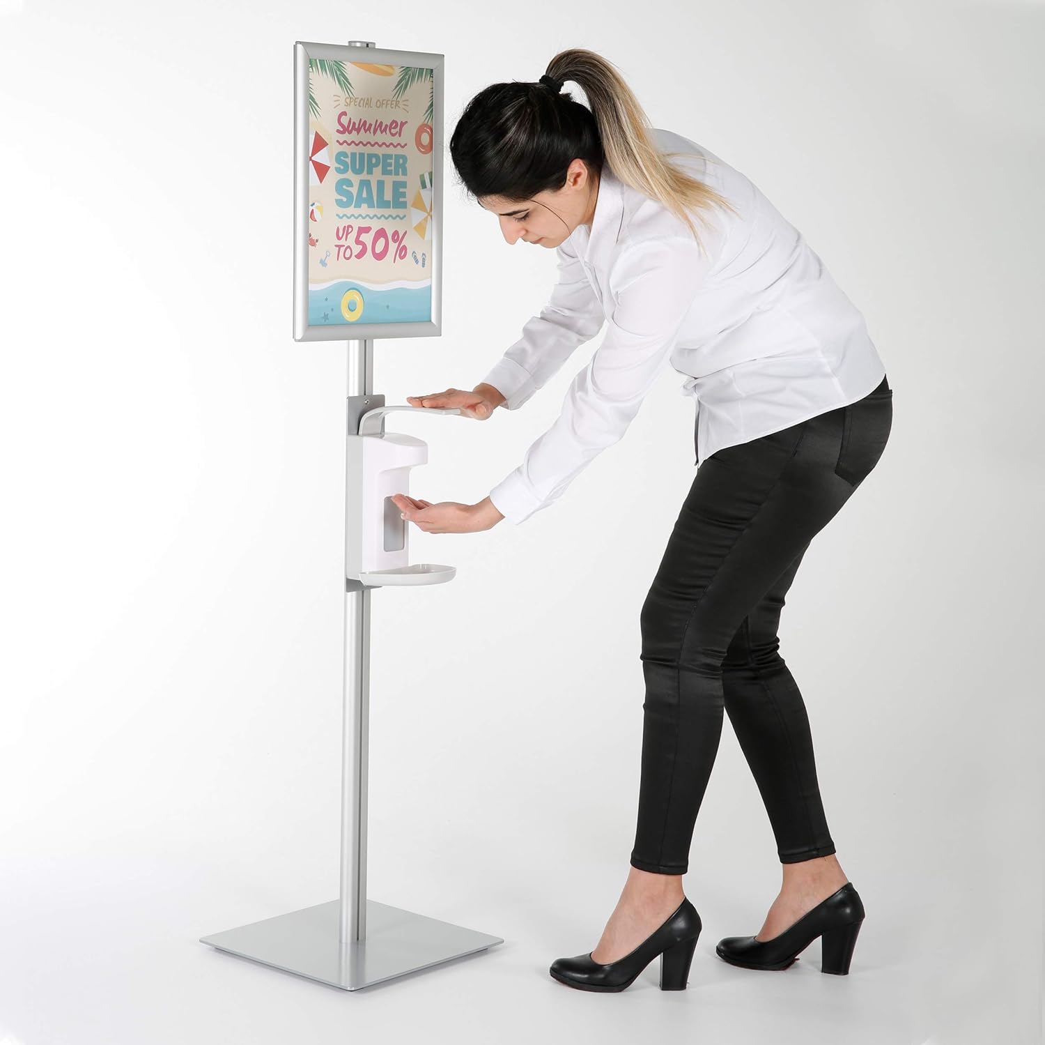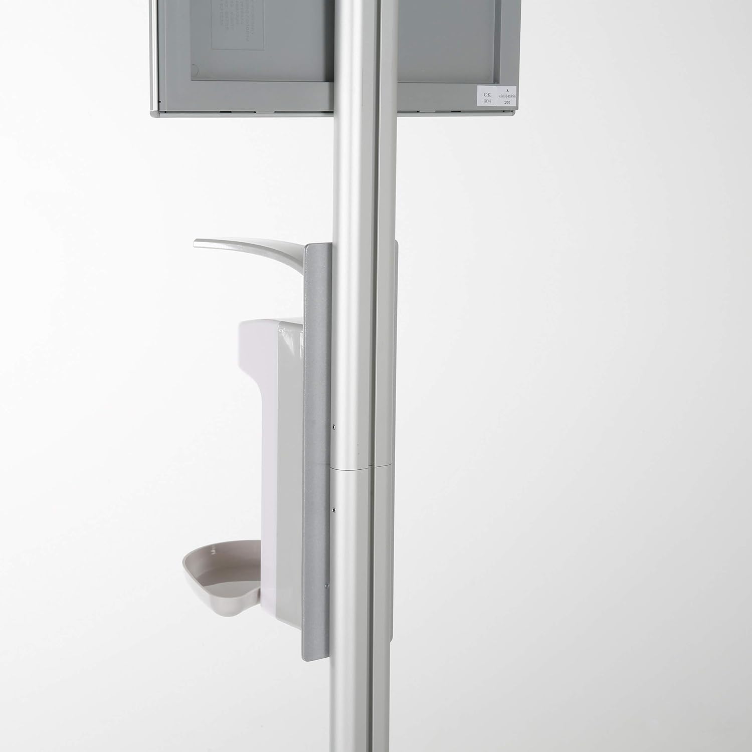 M&T Displays Hand Sanitizer Floor Stand 500 mL. (16.9 oz.) without Gel for Liquid/Lotion Soap or Hand Sanitizing Products, Manual, Push Bar with 11x17 Inch Opti Snap Frame Message Sign PostM&T Displays Free Standing Sanitizer Dispenser helps you to serve sanitizing products. Free Standing post makes this station mobile. It can be carried wherever you like. The heavy base ensures stability. Dispenser's height can be adjusted. Sanitizing gel is not included. You can load 11x17 Inch (A3)advertisement, poster or sign on the front loading snap frame.Dispenser is manual, hand operated with a large push bar. The top positioned, large, gentle push bar allows you to adjust quantity while using and It can be operated with your elbow or arm for dispensing. This dispenser meets all ADA requirements and is easy to mount, making installation a breeze! Soap or sanitizing gel is not included.This Sanitizing Station is made of the finest materials while providing the highest level of quality. The heavy base ensures stability. The aluminum body makes the product durable yet light for easy carrying. Anodized finish will protect the body from dust and light scratches.Size: 11x17 inchesCapacity: 500 mL. (16.9 oz.)Color: SilverMaterial: AluminumBacking: PolystyreneFrame Type: Opti Snap FrameCorner Type: Safe CornerUsage: IndoorProduct Dimensions: 13.8x13.8x61.2 inchesPackage Dimensions: 32.28x16.14x5.9 inchesPackage Weight: 22.04 lbs