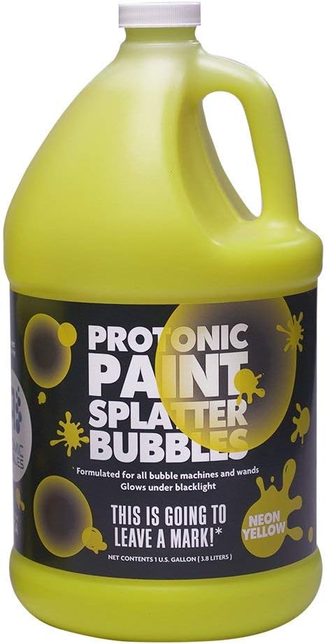 The most colorful, flying neon bubbles the world has ever seen! We combined our world-renowned BUBBLE LOVE bubble fluid and added the proprietary compounds that make our TEKNO BUBBLES magically glow under blacklight. And then, we added brilliant neon colors to the mix. Pink and green, yellow, orange and purple, even ghostly white! The result is our amazing PROTONIC PAINT SPLATTER BUBBLES – a virtual rainbow of neon bubbles that glow like no other under UV Blacklight. They’re perfect for any event you’d like to make memorable with a splash of color. JUST BE FOREWARNED: These bubbles will leave a mark!Because they have the potential to stain porous materials and clothing, they are best used outdoors. If you have an inside event, you’ll want to take special precautions first. Check out our FAQsfor details. Details Colors available: Neon Pink Neon Orange Neon Yellow Neon Purple Neon Blue Neon Green Neon Ghost Available in: 4 oz. (RTU) 32 oz. (RTU) 1/2 Gallon (RTU) 1 Gallon (RTU) 1 Gallon Concentrate Bulk orders available – just ask! Safe, non-toxic These bubbles leave a mark! Made in the USA