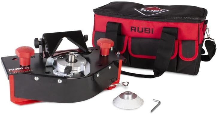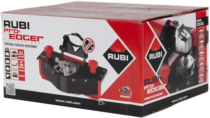 The RUBI PRO-EDGER Bevelling and Mitring Accessory is the ultimate tool for professionals handling intensive tile projects, designed especially for large format tiles and natural stone materials. Built to offer precision, durability, and convenience, this system is engineered to perform 45° mitre cuts on materials up to 3/4" thick and supports unlimited thicknesses for bevelling, making it a versatile choice for complex installations. The progressive depth control system ensures an even wear distribution on grinding wheels, significantly extending their lifespan while delivering smooth, consistent results that simplify tile edging for the user. This accessory is compatible with popular angle grinders, fitting both 4 1/2" & 5" (115 & 125 mm) models with ease, whether corded or battery-powered. Thanks to its M14 threaded shaft and quick-fastening belt, installation and removal are quick and secure. Built to withstand the rigors of professional use, the PRO-EDGER’s durable carbon steel chassis and highly friction-resistant polyethylene slides ensure stability and longevity even under demanding conditions. In addition to structural durability, the PRO-EDGER is equipped with dust-sealed high-speed bearings that prevent dust penetration during bevelling and mitring. This feature, combined with compatibility for external dust extraction systems, makes it possible to maintain a cleaner, safer work environment—a key advantage for health and workspace maintenance. The 45° x 3/4" grinding wheel (Ref. 16946) is included to get you started right away, with easy, tool-free wheel changes to keep your workflow uninterrupted. With no need for water, maintenance is as easy as wiping with a damp cloth, making the RUBI PRO-EDGER the go-to accessory for high-performance tile and stone installations.