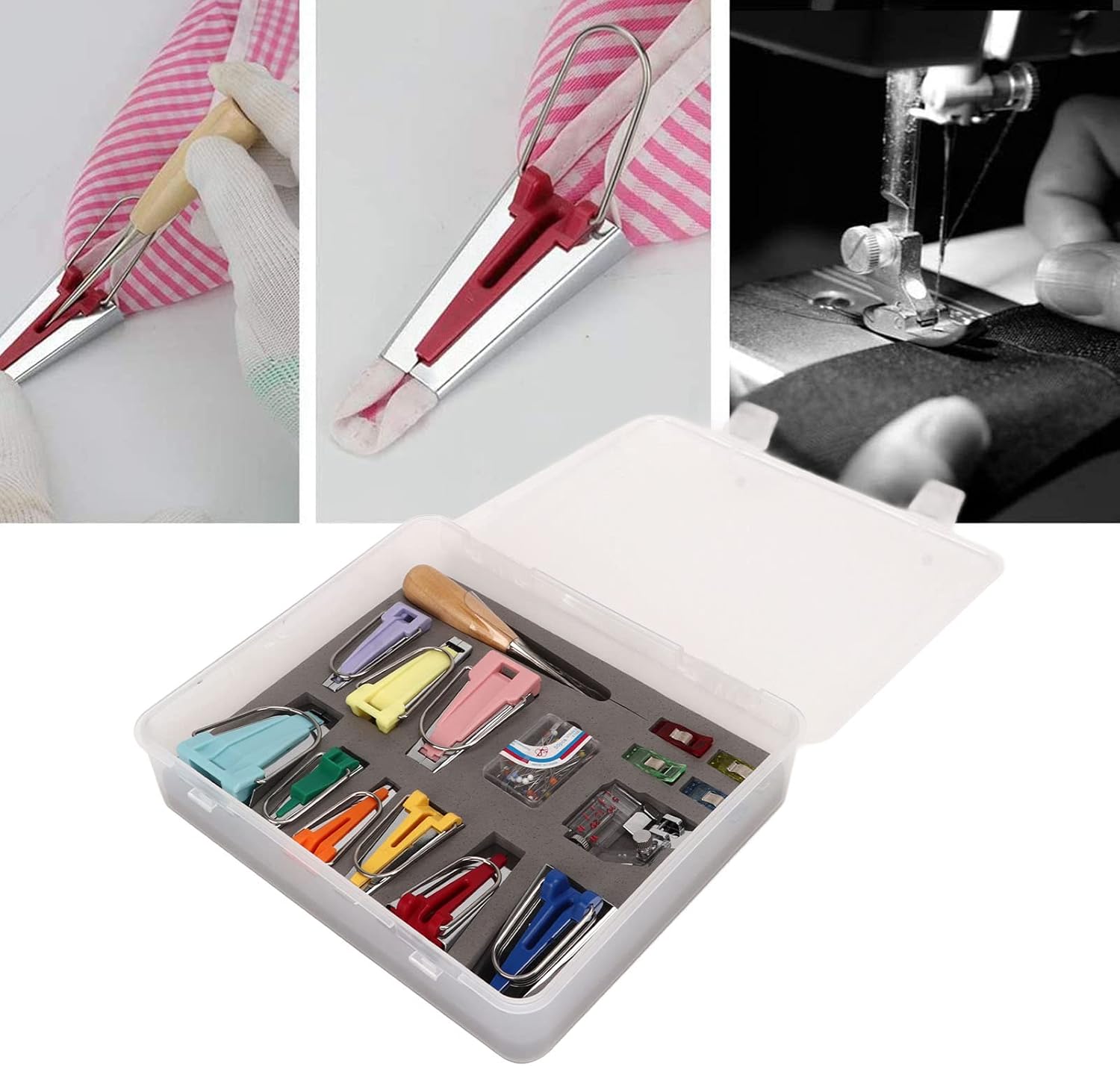 Specification:Item Type: Sew Bias Tape Maker KitMaterial: Stainless Steel, PlasticProduct Specification: 1 SetProduct Use: HouseholdScope of Application: Most ScenesBox Size: Approx. 21 x 18 x 5cm / 8. 26 x 7. 08 x 1. 96inPackage List:9 x Tape Maker4 x Clips 1 x Snap on Foot1 x Box of Bead Needle1 x Quilt Awl1 x Plastic Box