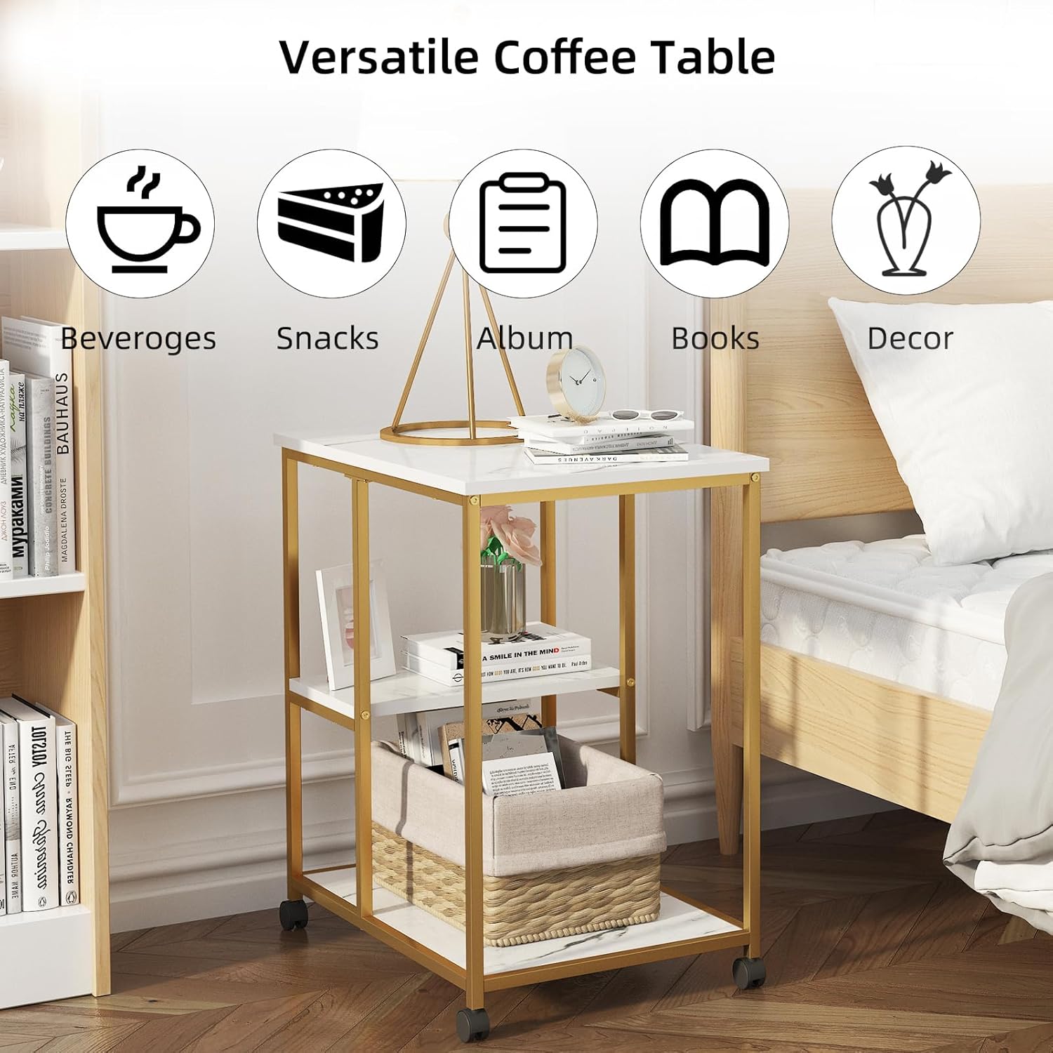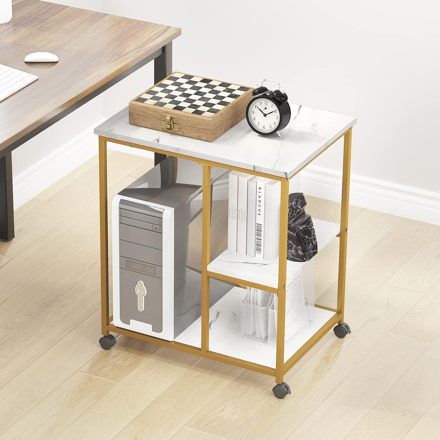 sogesfurniture Gold Bar Cart with 2 Shelves, Wine Glass Bottle Storage Bar Serving Cart with Wheels for Kitchen Living Room, Utility Bar Serving Cart Kitchen Island Rolling Cart on Wheel