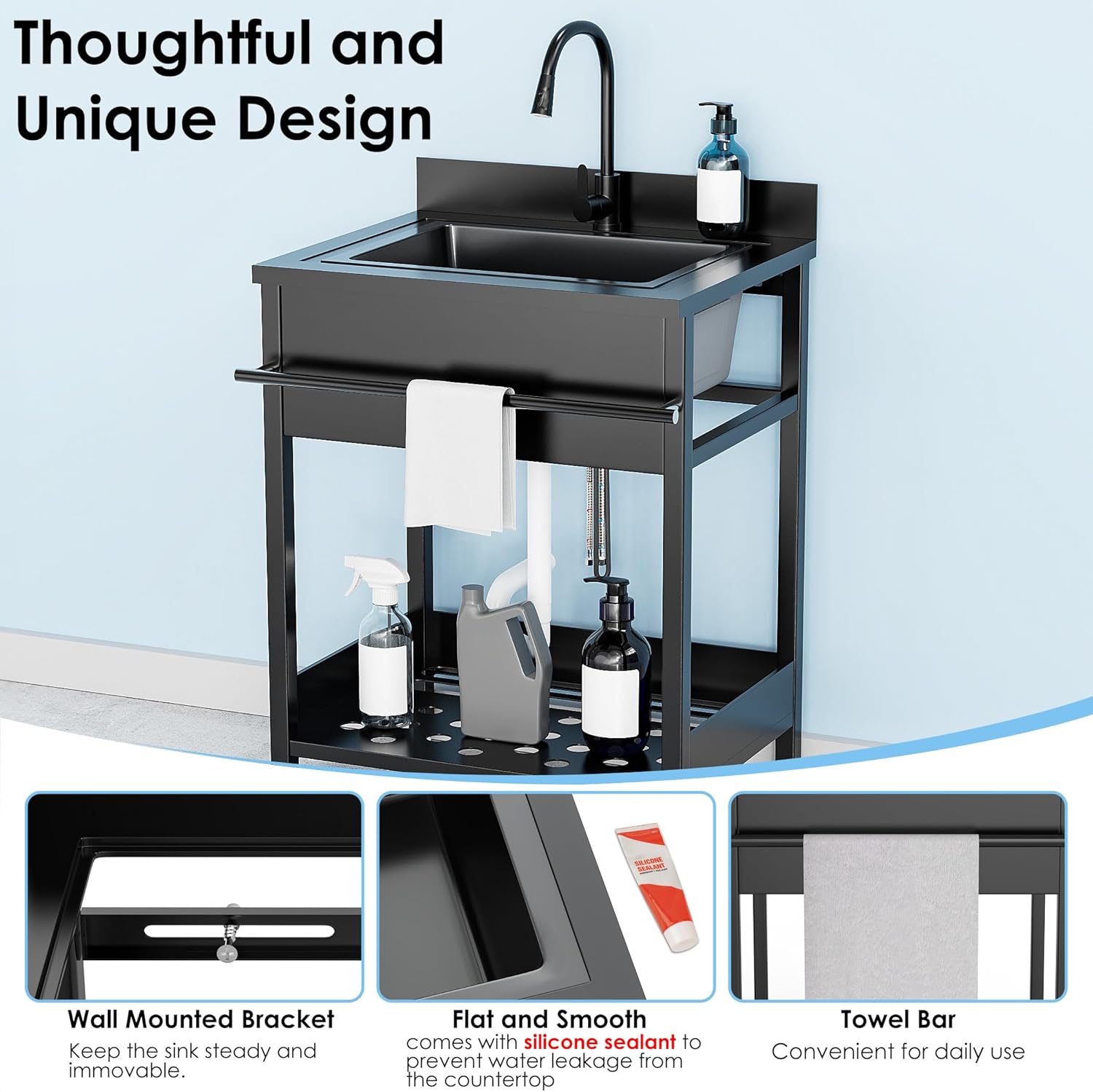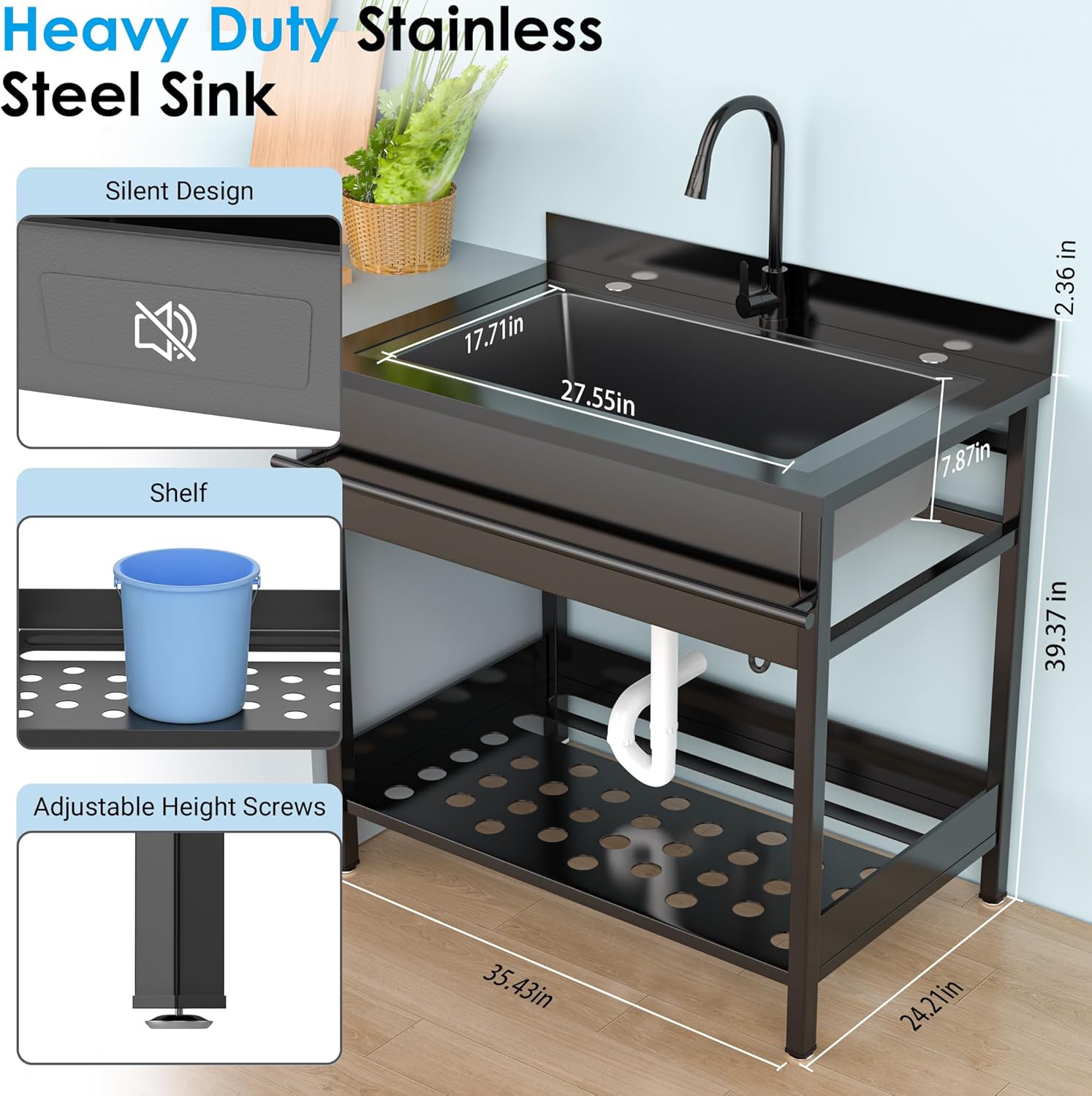 Stainless Steel Utility Sink, Free Standing Single Bowl Sink with Cold and Hot Water Pipe for Laundry Room Bathroom Farmhouse (35 Inch)