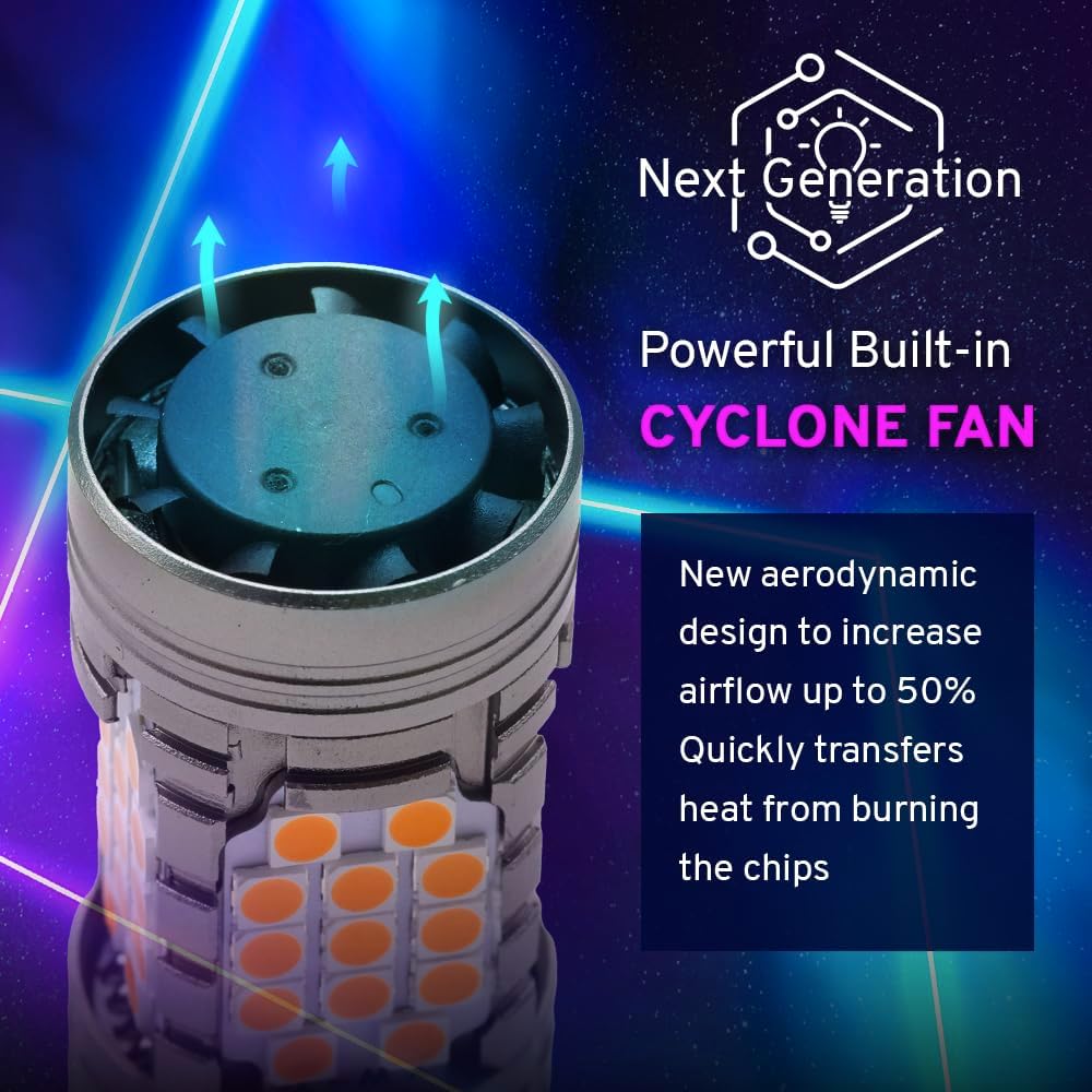 Upgrade your vehicle’s visibility and style with Syneticusa 1157 LED turn signal bulbs. Expertly engineered with advanced LED technology, these bulbs deliver an impressive 500% brighter amber illumination compared to traditional halogen bulbs, greatly enhancing your safety on the road. Featuring 20 premium-grade 3030 LED chips per bulb, they produce a powerful 4000 lumens at 48 watts, providing consistent 360° lighting. Designed with an integrated resistor system, these bulbs offer seamless compatibility with 99% of vehicle CANBUS systems, eliminating hyper-flashing and error codes without the need for external resistors. Syneticusa’s intelligent temperature management system, combined with durable aluminum housing and internal heat fins, ensures exceptional performance and extends bulb lifespan up to 30,000 hours.