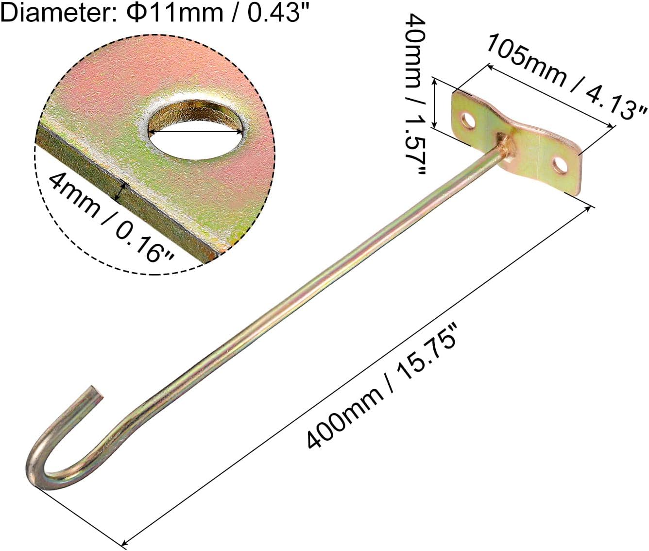 Features:1. MATERIAL - This Ceiling Hook is made of carbon steel material, with an electroplate finish, it is sturdy, shining, without scratches, wear resistance, rust-proof, and corrosion.2. STRONG CAPACITY - The ceiling hook has a base with holes design, which has a high load-bearing capacity, and easy for assembling screws.3. EASY TO INSTALL - The carbon steel hooks can be assembled on the ceiling, just pre-drill a small hole with a machine or screw it with a screwdriver by hand to install and remove.4. WIDELY APPLICATION: The top mount wall hooks are great for use indoors and outdoors to hang fans, lights, lanterns, plant baskets, bird feeders, path lights, handbags, yoga swings, sandbags, swing fixation, and other heavy items.Specification:Plate Thickness: 4mm / 0.16''Screw Hole Diameter: 11mm / 0.43''Size: 105 x 40 x 400mm / 4.13 x1.57x 15.75-inches(L*W*H)Package Content: 2pcs x Ceiling Hooks