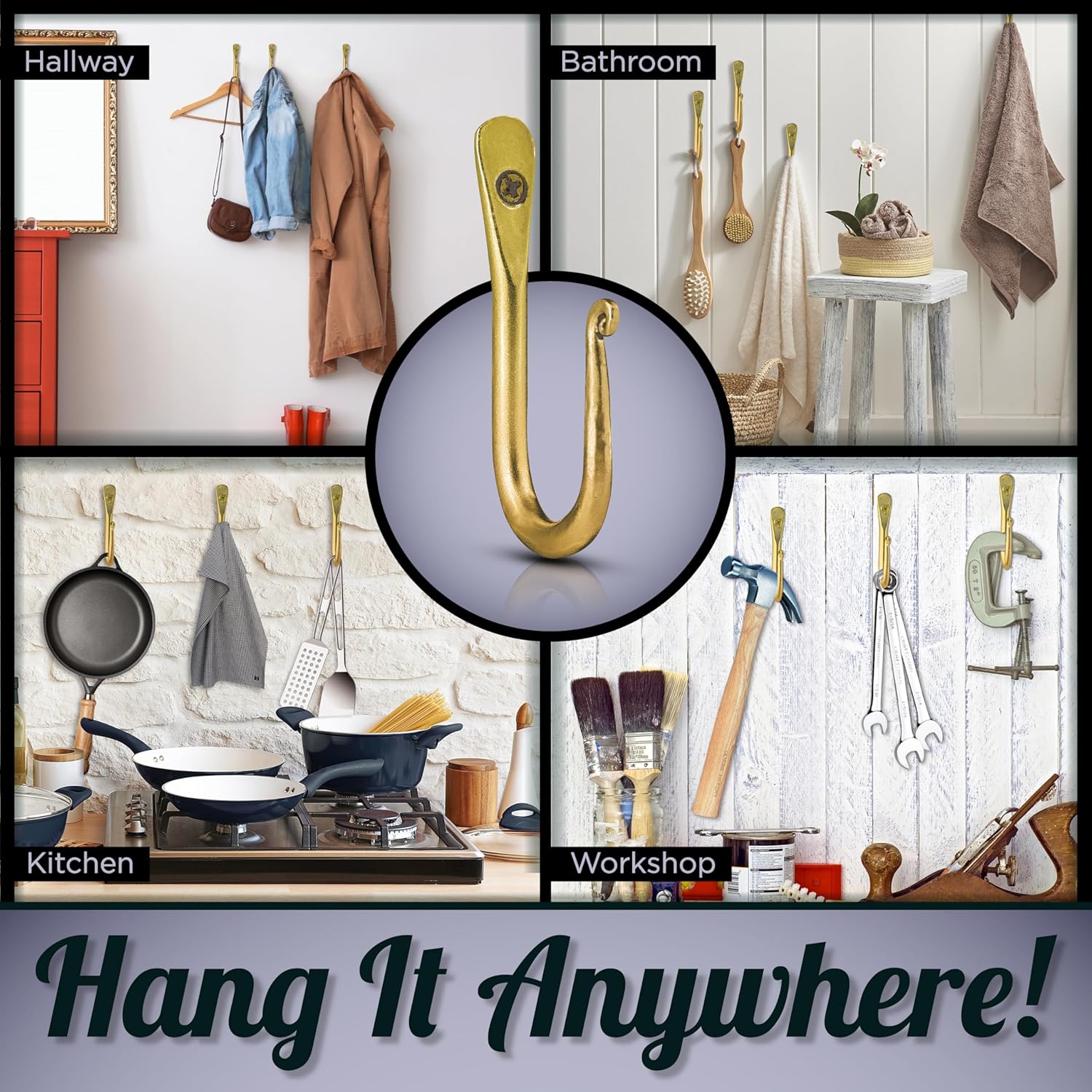 A decorative uniquely designed classic iron craft piece. Solid iron set of hooks with Gold color finish A great decorative room element, suit any room. Add extra storage and organization to your home with these iron hook hangers. Measures 3.7 inches long and extends about 2 inches from the wall. Easy to install, screws are supplied.