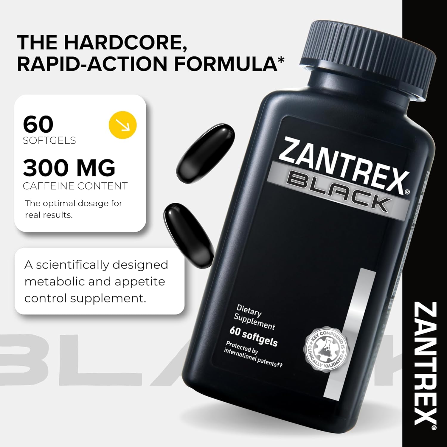 Zantrex Black isn’t just another weight loss pill—it’s a scientifically designed metabolic and appetite control supplement that contains a clinically validated compound that works with your body to boost GLP-1 production, regulate hunger, and support metabolism.* Each serving contains yerba maté, guarana, and damiana, clinically shown to enhance GLP-1 levels, reduce cravings, and control appetite naturally.* This thermogenic formula also includes 300 mg of caffeine for enhanced focus and sustained energy without the crash.* Zantrex Black helps to lower ghrelin levels, improve metabolic efficiency, and promote overall wellness.* This scientifically backed formula works with your body's natural processes to help you reach your weight goals effectively.* Available in 60-count and 84-count options, Zantrex Black is designed for those who want fast-acting, sustained metabolic support in a convenient softgel format. *These statements have not been evaluated by the Food and Drug Administration. This product is not intended to diagnose, treat, cure, or prevent any disease.