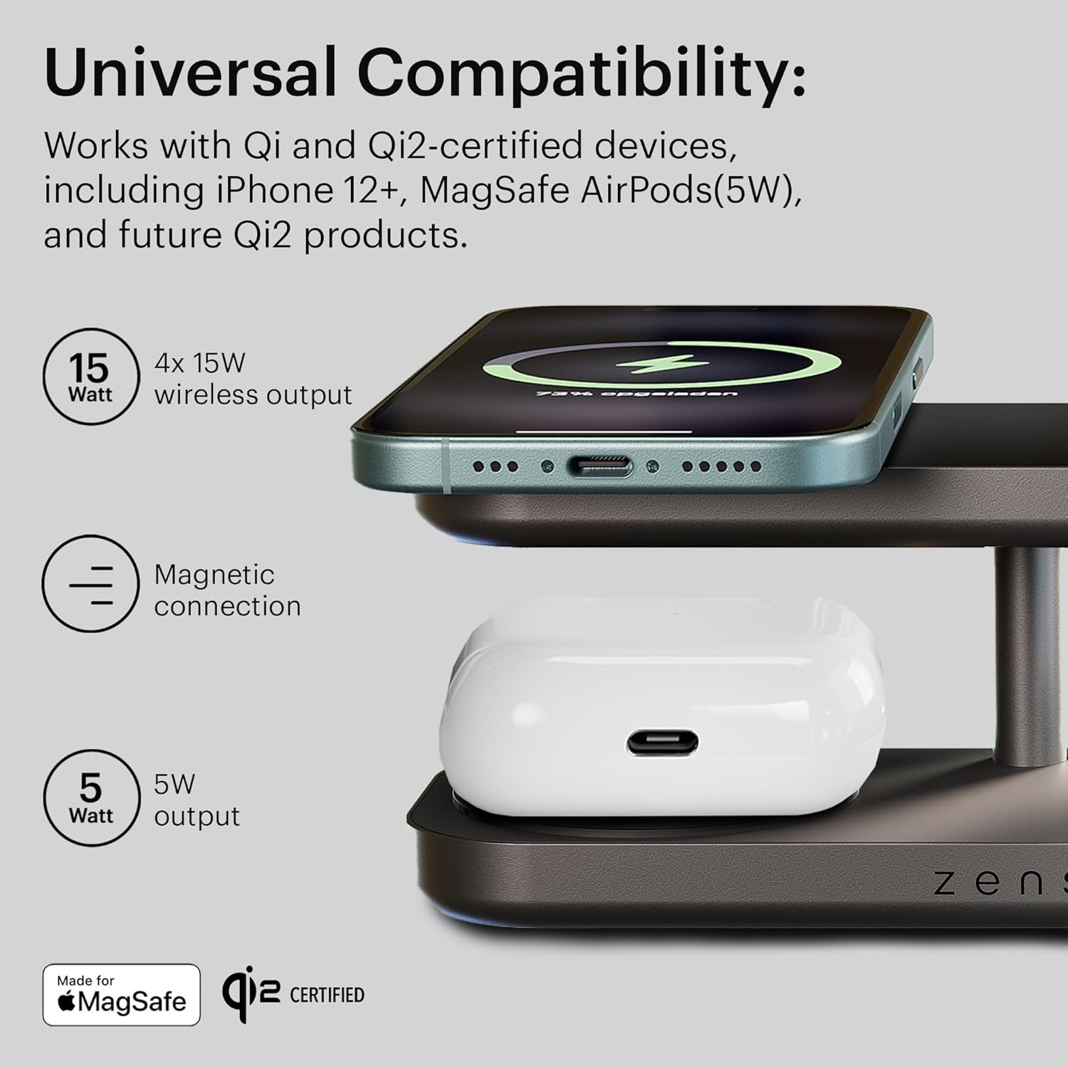 | Compatible Devices | Airpods generation 2 & 3, AirPods Pro (all generations), All Qi2 compatible smartphones, iPhone 12, 13, 14, 15, 16 |